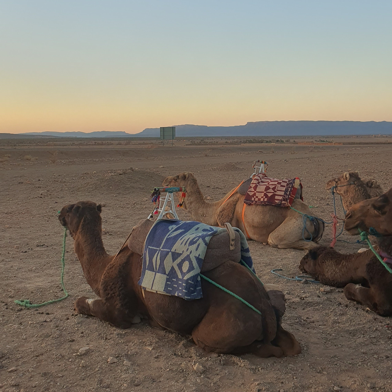 자고라 사막, 드디어 도착했다. 자고라 사막은 사하라 사막의 초입에 해당되는 곳이라 했다. 버스에서 내리니 우리를 텐트로 데려가기 위해 낙타들과 사막에서 사는 노마드 사람들이 기다리고 있었다.