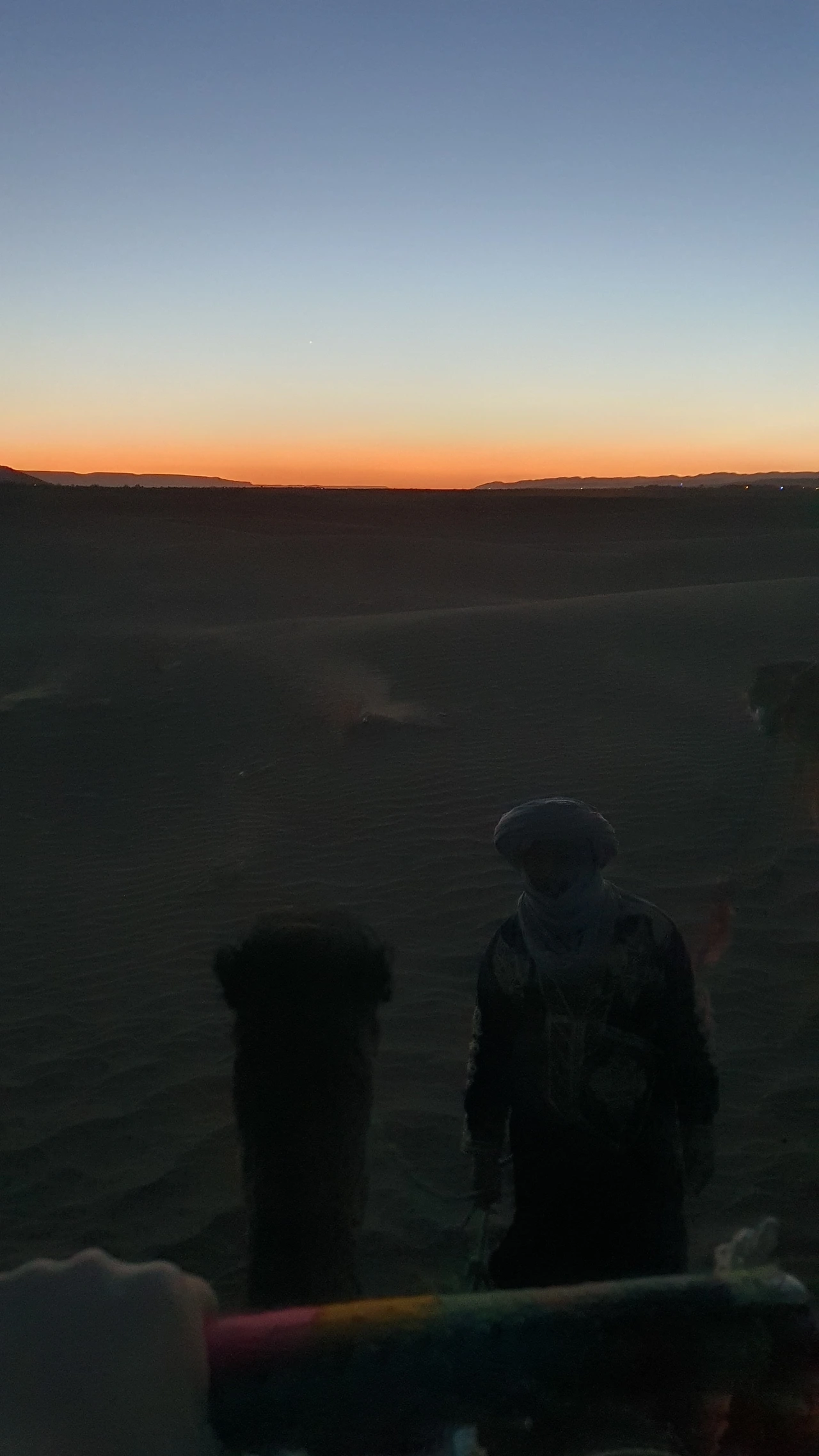 낙타를 타고 조금 걷다 하니 저 산 너머로 붉은 해가 떨어지는 것을 보았다. 그렇게 사막에서의 밤이 시작되었다.