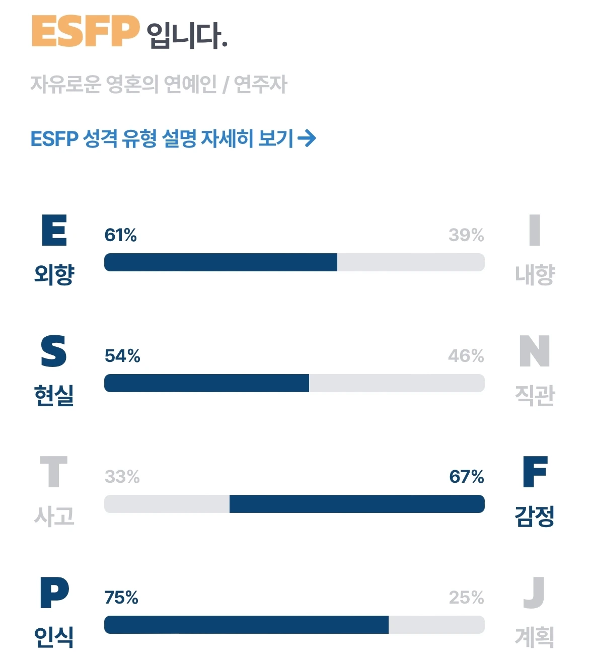 결국 '계획'이라는 이 거창해보이는 단어를 받아들이는 방식과 정도가 다를 뿐, 누구나 계획적인 사람이라는 말이다. MBTI 결과지를 봐도 각 구성요소마다 어느쪽에 가까운지 정도를 표시하는 %가 있지, 어떤 한 쪽 성향만 가진 사람은 없다. 생각해보면 당연한 것이, 인간처럼 복잡한 매커니즘을 가진 생명체를 고작 4가지 항목으로 구분한다는게 모순이기는 하다. 아마 수만가지 항목을 가져와서 성격테스트를 만든다고 해도 완전히 정확하게 한 사람을 평가하는 것은 불가할 것이다.