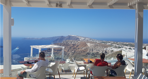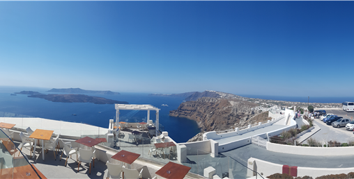 내부에 들어와서 보니 와이너리 테라스에서 보이는 전망이 정말 말로 표현하기 어려운 장관이다. 산토리니의 본섬은 남북으로 길게 늘어져 있는 모양의 섬인데, 이곳 와이너리가 산토리니에서 가장 높은 곳에 위치하고 있어서 산토리니의 동해안과 서해안이 한눈에 들어오는데, 이런 장관이라니! 정말 감탄하지 않을 수가 없다.