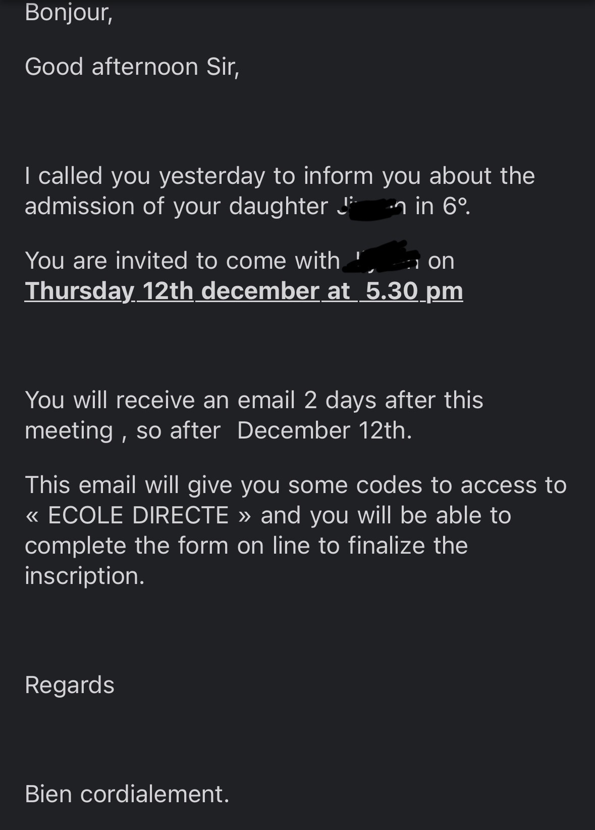 프랑스 전체 사립학교 중 10위 이내, 남프랑스로 한정지었을 때 두번째 순위의 명문 사립학교에 합격했다. 최소 100:1의 경쟁률이었다는데 그걸 뚫었네..