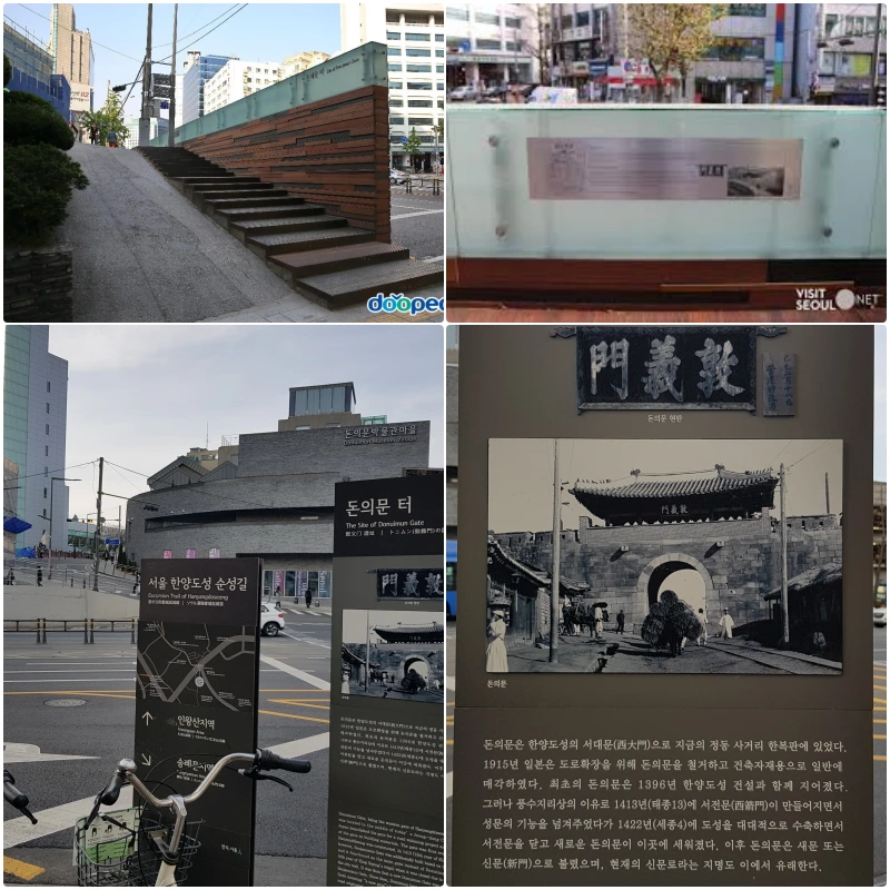 이 주변에 돈의문(敦義門)이 있었다. 돈의문은 보통 서대문(西大門)이라 부르는, 한양도성 4대문 중 하나이다. 태종 때 풍수상 좋지 않다 하여 도성 서쪽 문을 폐쇄하고, 멀지 않은 곳에 새로 지어 서전문(西箭門)이라 이름 붙였다. 세종 4년, 도성을 대대적으로 다시 쌓을 때 서전문을 헐고 그 자리에 돈의문을 지었으니 그게 세칭 서대문이다. 1899년 ’마포 종점‘~아현동을 거쳐 도심으로 들어가는 전차 노선의 복선화 공사 시 헐려서 지금은 이름만 남아 있다. 강북삼성병원 동쪽 모퉁이에 있는 인도(人道) 계단에 ’돈의문터‘라고 안내판이 2020년까지 설치되어 있었는데 어찌된 일인지 완전히 제거하고, 횡단보도 건너편 정동 입구에 표지판 형태로 다시 세웠다. 이유는 모르겠으나 원래 자리에 더 가까운 곳에 세운 것 아닌가 추측할 뿐이다.