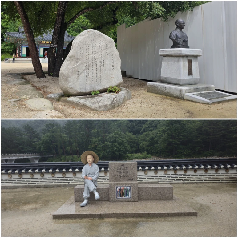 백담사의 전설, 또 한 분의 스님 얘기도 곁들이려 한다. 2019년 입적했으니, 전설 치곤 오래 안 된 인물이다. ’신흥사‘, ’낙산사‘, ’백담사‘ 등의 주지(住持)로, 회주(會主)로 수십 년을 이끈 스님이니, 설악산은 물론 강원도를 대표하는 승려로 꼽힌다. 화재로 온 국민의 가슴을 먹먹하게 했던 양양 ’낙산사‘의 성공적인 복원에도 큰 영향을 미친 분으로 불교식으로 소개하자면 '설악당(雪嶽堂) 무산(霧山) 오현(五鉉)스님'이시다. ’조오현‘이란 필명으로 시조 및 시, 선시를 두루 지은 시인으로, 문단의 어른이자 후원자였으며, 시집 ’아득한 성자‘로 2007년 ’정지용 문학상‘을 수상하는 등 여러 문학상을 수상하기도 했다. 이곳 백담사에 그 분의 ’상(像)과 시비(詩碑)를 아우른 조형물이 있어 일단 소개하지만, 뒤에 들를 '만해 마을'에서 또 언급하지 않으면 안된다. 여기 새겨진 시는 ‘허물’이다. '남의 삶은 다 보이는데 내 삶은 보이지 않네/남의 죽음은 다 보이는데 내 죽음은 보이지 않네/그것 참 남의 허물은 다 보이는데/내 허물은 보이지 않네‘. ‘아득한 성자, ’비슬산 가는 길‘, ’파도‘ 등 좋은 시가 많지만, 이 시도 참 좋다. 여기 있는 ’무산 스님상‘과 아주 비슷한 것을 낙산사에서도 본 적이 있다. 거긴 ‘파도’라는 시가 새겨져 있다는 사실은 분명히 기억하는데, 전신상이 여기 것과 똑 같은지 확신이 없다. 그 얘기는 뒤에 낙산사 기행에서 다뤄야 할 것 같다. 이 절의 큰어른이 시인이어서 그런지 백담사 경내에는 유난히 시비가 많다. 매월당 김시습, 허응당 보우스님 같은 불제자의 시야 있을만 하지만, 김구용, 오세영 같은 현대 시인들의 시비들이 눈길을 끈다.
