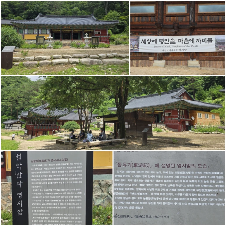 경내에 세워진 “‘동유기(東游記)’에 설명된 영시암의 모습“, 제하(題下)의 해설판을 읽어보니 맨 아래 ‘圃陰集, 김창즙(金昌緝, 1662~1713)’이라 쓰여 있다. 위에서 언급한 김수항의 아들 ‘6창(昌)’ 중 다섯째인 '김창즙'이 셋째 형 은거지에 놀러왔다가 밤에 달구경 절경에 감탄하는 내용이다. 그 형제들 모두 학문과 문장으로 유명한 인물들이니 '김창즙'의 문집도 현재까지 전한다. 포음(圃陰)은 그의 호이다. 김창흡은 창건 이후 6년간 머물다 더 이상 머무를 수 없는 사정으로 이곳을 떠나 가니, 암자는 폐허가 된다. 이후 몇 차례의 중건과 보수를 거쳐 명맥을 이엇으나, 6.25때 아예 전각이 소실된 것을 1994년 백담사 주지 ‘설봉도윤(雪峯道允)’이 중창했다는 내용도 보인다.
