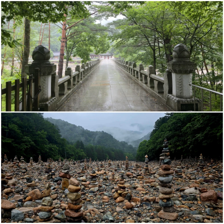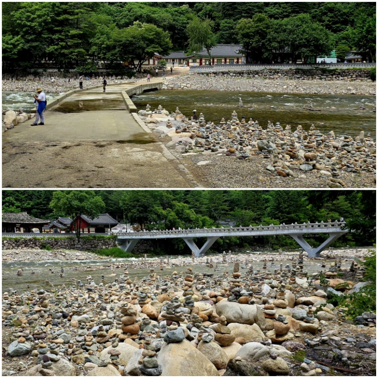 들어갈 때 걸었던 ‘修心橋’ 가 놓이기 이전에 드나들던 다리 겸 보(洑를)를 통해 백담사를 나온다. 이 다리의 이름은 ‘수보교(修菩橋)’이다. 아마 ‘菩(보)’는 ‘보리(菩提, 깨달음)’나 ‘보리심(菩提心)’을 의미하지 싶다. 들어갈 땐 마음을 닦고, 나올 땐 보리심을 닦으라는 말씀인가. ‘수보교’는 ‘수심교’에 비해 낮아 물과 가깝고 난간이 없어서 비가 올 때는 발목 넘어까지 물이 잠기는 재미에 왔다갔다 한 적도 있다. 쭈그리고 앉아 수구(水口)로 들어가는 물과 빠져나가는 물살을 보다가, 물안개 낀 깊은 산중을 올려다보면 시간 가는 줄 모르는 신선 놀음의 다리이다. 그리고 내려서면 바로 자갈밭과 ‘돌멩이탑’들이니 속세와 다른 놀잇감이 즐비하다.