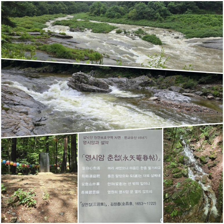 영시암 가는 길. 이것저것 해찰하고, 시문 해설을 읽으며 1시간 남짓 걸어 올라가니 영시암에 도달했다. 김창흡이 직접 지은 암자이자 은둔처였던 ‘영시암(永矢庵)’의 '영시'는 ‘시경(詩經)’에 나오는 표현으로, 화살을 꺾어 부러뜨리며 다시는 돌아가지 않겠다고 굳게 다짐하는 의지에서 따온 말이라 한다. “한번 시위를 떠난 화살처럼 다시는 원점으로 돌아가지 않겠다는 의지를 나타낸 이름 아니겠나”는 나의 예상은 엉터리로 판명나고 말았다. 영시암에는 등산객과 뜨내기 길손들을 위한 배려의 흔적이 여기저기 많다. 앉을 자리도 많이 설치했지만, 비 맞지 않게 지붕 얹은 공간에 뜨거운 물이 늘 끓고 있는 대용량 전기 포트, 그 곁에 놓인 ‘우리 차 티백(Tea bag)’. 심지어 화장실을 묻는 나에게 다실(茶室)에 들러서 차 한 잔 드시고 가시라는 권유를 하실 정도이다. 길손들이 준비해 온 도시락이나 컵라면을 드시는 쉼터이기도 하지만, 점심시간에 국수 공양을 하신다는 말씀도 들었다.