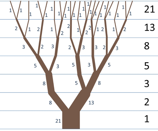 수학은 자연의 원리를 알아내고자 세밀하게 관찰합니다. 나뭇가지가 자라는 양상을 관찰하며 발견한 숫자는 황금비율(1:1.618)입니다. 생명의 탄생과 성장에 대한 숨겨진 코드입니다. 피보나치수열이라고 불리는 이 숫자는 전전항과 직전항의 합으로 이루어집니다. 계속 증가하는 수열입니다. 이것은 자연현상만 해석할 수 있는 것이 아닙니다. 수학 문제의 발전 현상으로도 해석할 수 있습니다. 지류에 21이란 숫자를 문제의 유형이라고 볼 수 있습니다. 21개의 유형을 보여주는 유형서라고 생각하면 됩니다. 수학 공부를 하는 학생들의 흔한 착각은 여기에 있습니다. 21개의 유형이 끝이라고 생각합니다. 문제가 달라질 수도 있다는 생각을 못 하고 그대로만 암기식으로 익히는 공부를 합니다. 21개의 유형은 곧 34개로 확장되어 시험 문제에 등장합니다.