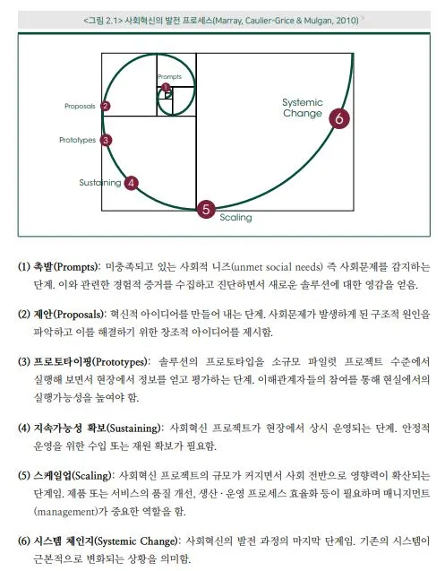 <그림 2. 사회혁신의 발전 프로세스 (Marray, Caulier-Grice & Mulgan, 2010)>