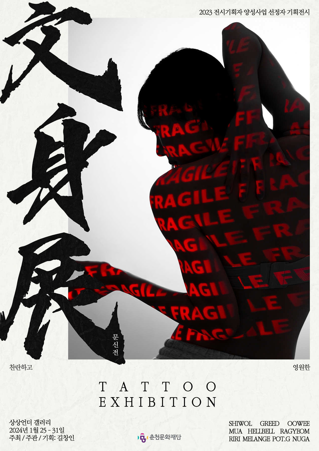 포스터는 기이한 포즈를 취한 여자 모델의 몸에 FRAGILE이라는 글자가 반복되는데요. 지금 보니 최근 본 '파묘'의 포스터와도 비슷해 보이네요. '신체에 새기는 글'이라는 문신의 의미에 맞게 사람의 몸 위에 작품을 운송할 때 사용하는 'FRAGILE'이라는 글자를 얹어 신체가 곧 작품임을 상징적으로 보여주고 싶었습니다. 포스터 모델은 춘천에서 활동 중인 김채린 현대무용가입니다.