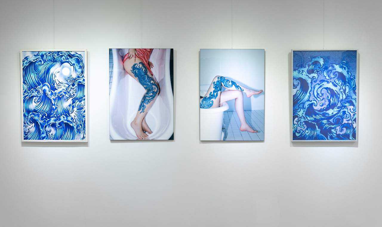 이번 작품은 멜란지님의 그림과 사진인데요. 파란색을 주로 활용해서 그림을 그리는 멜란지님은 파란색을 '가장 솔직한 감정이 담겨진 색'이라고 표현합니다. 색을 대하는 그의 태도 탓인지, 파란색의 작품은 차갑다는 인상보다 오히려 포근함을 불러일으킵니다. 파도와 푸른 용이 따뜻하게 피부를 감싸, 조선의 백자처럼 신체는 작품이 됩니다. 멜란지님은 작품을 인화하는 방식에도 정말 많은 고민을 한 것이 느껴지는데요. 멜란지님은 사진은 아크릴 인화 방식으로, 그림은 디지털 잉크젯 종이 인화와 캔버스 인화 방식으로 작품을 제작하셨습니다. 실제로 작품을 관람할 때, 욕조 위에서 찍은 컨셉 사진은 빛이 반사되어 작품의 묘미가 더욱 살아납니다. 푸른 용의 해인 갑진년은 아마 멜란지님의 해일 것 같네요.