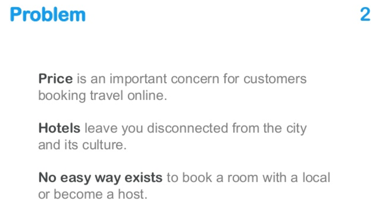 제품/서비스는 문제를 해결하는 것에 초점을 맞추어 설계되어야 한다. 제품/서비스는 문제를 해결하는 수단일 뿐 목적이 되어서는 안 된다. 스타트업의 목적 자체는 문제로 인해 생기는 고객들의 needs를 충족시키는 것이다. 가치는 문제와 연결된 고객들의 needs를 충족시키면서 창출이 되며, 스타트업은 사업 초기 테스트 등을 통해서 증명해내야 다음 단계로 나아갈 수 있다. 에어비엔비라는 서비스는 여행객들과 현지 문화를 연결하는 것에 온전히 초점을 두었고 이는 곧 큰 성공으로 이어졌다.