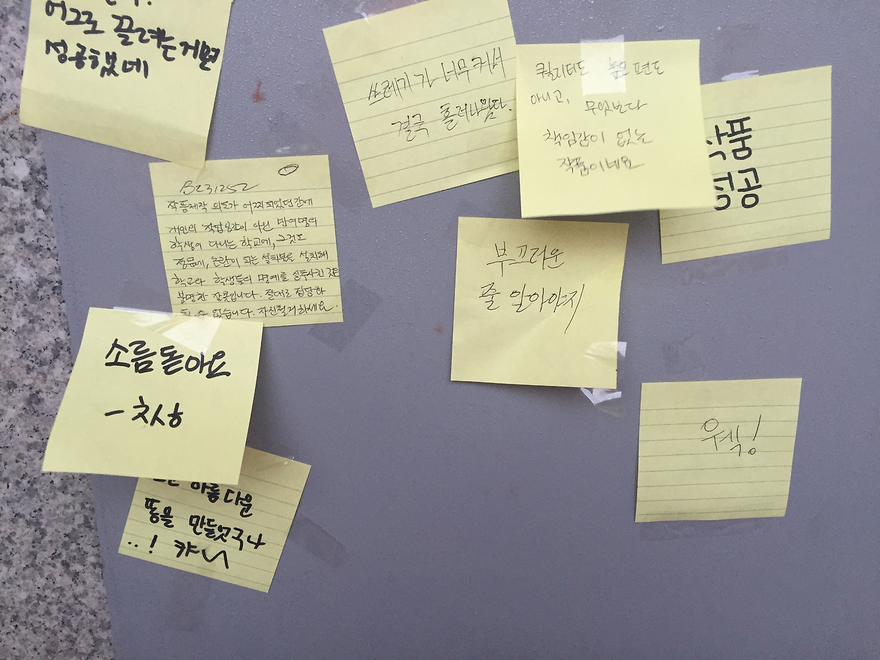충분하다. 그렇기에 작가의 의도는 그다지 중요치 않다.) 관찰한 사람들 대부분은 일베 조형물에 대해 강한 불쾌를 드러냈다. 조형물을 향해 계란을 던졌고, 비방 포스트잇을 부착했다. 언론은 주변에 상주하며 사람들의 반응을 확인했고, 결국 설치 이틀 만에 조각은 파괴되었다. 주동자는 자신의 행위가 익명의 광기로 해석되는 것에 강하게 반발하며 떳떳한 ‘범법자’이길 자처했다. (이 부분은 굉장히 흥미로운 지점이다.-아래 계속.) 이 상징물이 도대체 무엇이었길래 사람들을 이토록 흥분시킨 것일까. 사람들의 의견을 들어 보았다. 많은 사례를 종합하진 못했지만, 포스트잇에 적힌 내용과 SNS 게시글의 대략적인 내용은 다음과 같다. 사람들은 학교 구성원으로써, 자의와 상관없이 주어진 불명예에 수치스러워 했고, 공공에 불쾌감을 주는 작업이었다는 점에서, 작가의 도덕성을 비난했다. 함께, 설치 및 장소 선정의 방식에도 문제를 제기했다. 더불어 표현의 자유 논란은 이번에도 역시 빠지지 않았다. 난 이 기저를 형성하고 있는 것을 찾고 싶었는데, 역설적이게도 그것은 또다른 혐오였다.