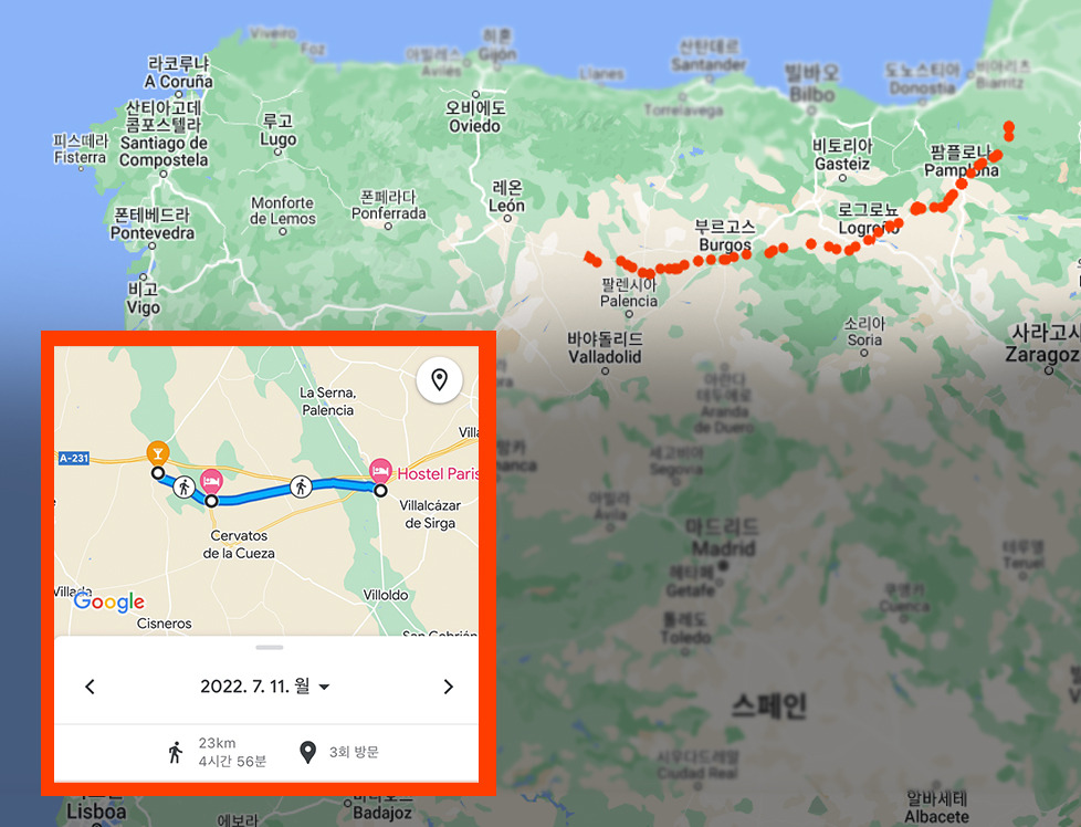 이런 태도가 괘씸했던 걸까. 까미노는 오늘 화가 잔뜩 난 모양이다. 내 눈을 의심할 수 밖에 없었다. ‘다음 마을까지 18km’. 보통 오 킬로미터마다 마을이 하나씩 있기 마련이다. 길어도 십 킬로미터 정도. 그러나 십팔 킬로미터란 지금 이 알베르게에서 무려 네 시간이나 쉬지 않고 걸어야 하는 거리다. 어제 그 사실도 모른 채 마을 딱 한 개만 더 가겠다고 떠난 S가 고통스런 전언을 남겼다.