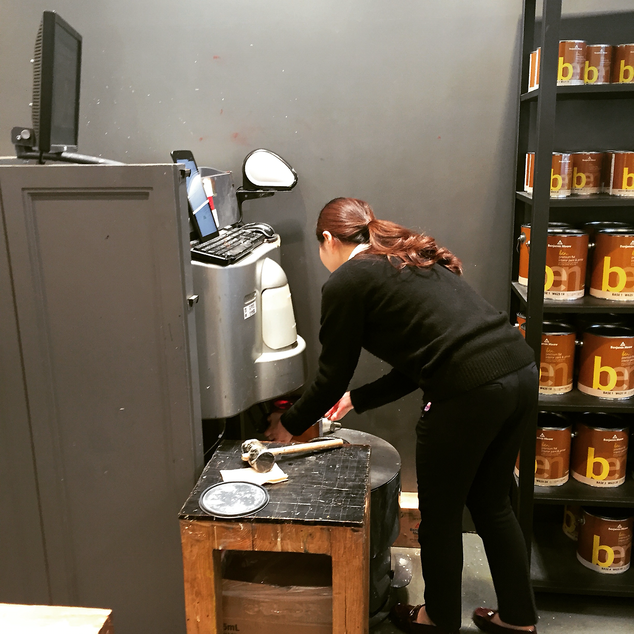 아이파*몰에서 색을 결정한 후, 구매는 벤*민 무어의 본점이자 쇼룸이 위치한 논현점에서 진행되었다. 벤*민 무어는 처음 페인팅을 접하는 사람을 위해 롤러, 붓, 마스킹 테이프, 커버링 테이프, 페인트 통 오프너 등을 한데 엮은 도구 패키지도 함께 판매하는데, 미국산과 중국산이 옵션으로 제공된다. 큰 차이는 없어보여서 가격이 조금 저렴한 중국산을 구입했다. 직원이 색에 대한 상담을 진행한 후 즉석에서 색상코드를 기계에 입력하고 페인트 베이스에 도료를 섞어준다. 후*필름의 자동 사진 현상기처럼 생긴 이 페인트 조색기는 신세계였다. 또한 페인트 주문 전 본점 쇼룸 2층에서 페인팅 체험이 가능하다. 나 역시 페인팅이 처음이라 롤러를 한 번 사용해보기로 마음먹고 체험 도구를 준비해달라 요청했었다. 여기에서 직접 페인트 붓, 롤러, 롤러 연장 스틱 등을 사용해 보는 것이 가능하다.