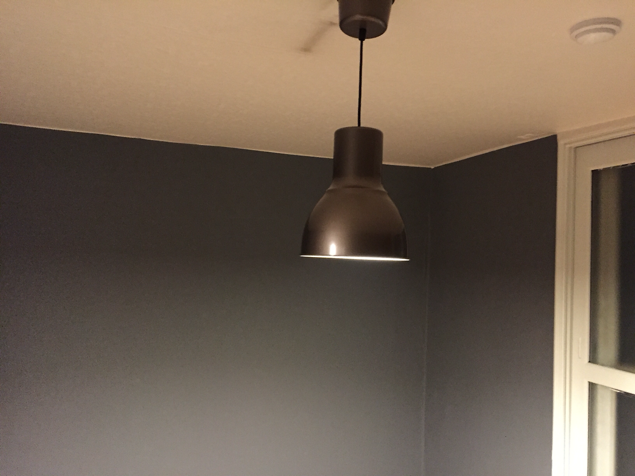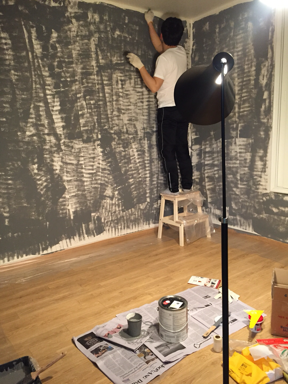 천장을 제외하고 페인팅이 완료되었다. 결과물이 나쁘진 않았는데, 이케*에서 구입한 펜던트형 조명을 달고 나니 기존에 있던 형광등 자국이 천장 벽지 위에 검게 남더라. 이를 커버하기 위해 다시 천장 페인팅 + 걸레받이 테이핑이 꼼꼼하지 못했던 부분을 위한 하자보수 페인팅을 감행했다. (ㅠㅠ)