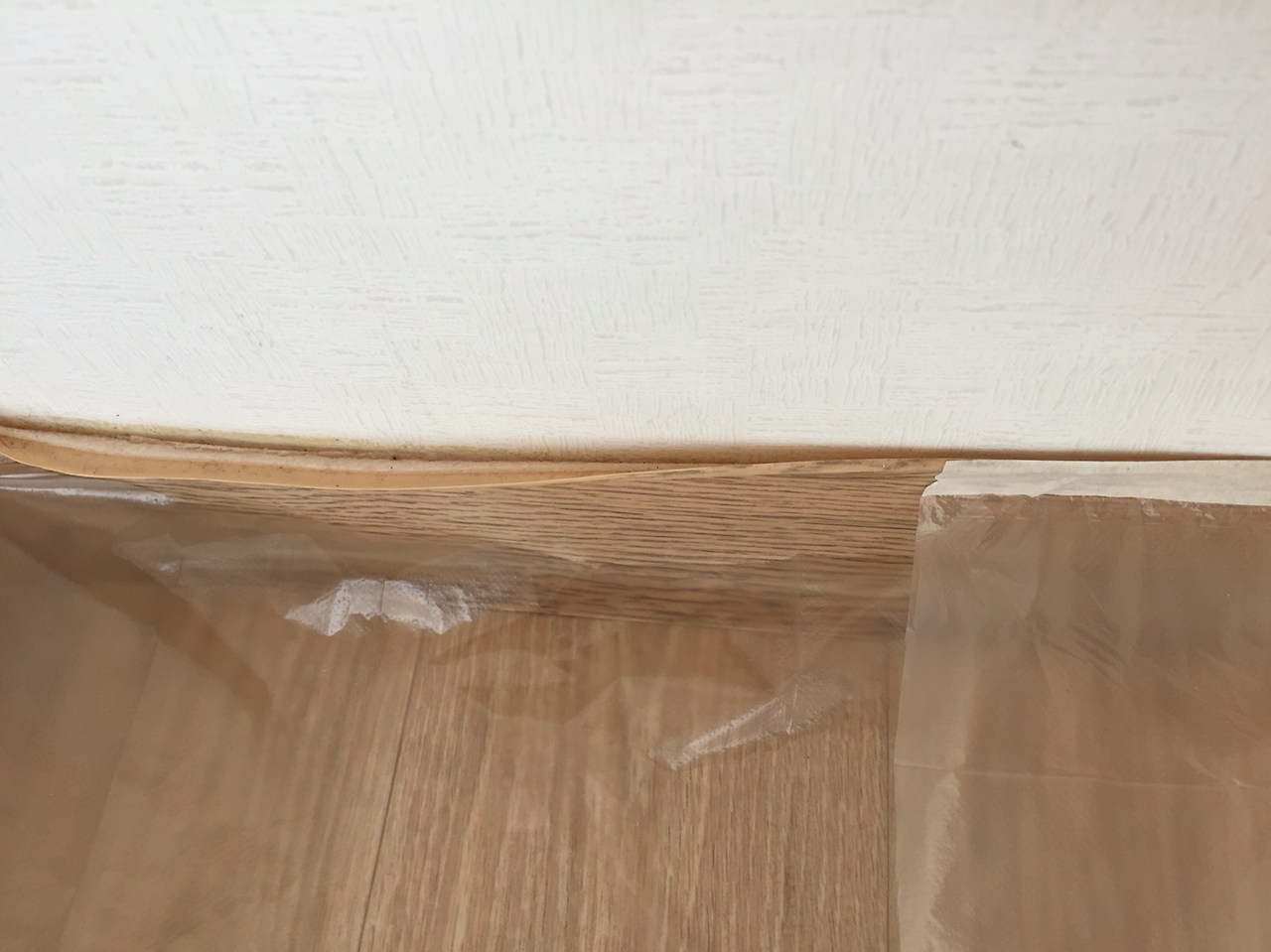 거실 페인팅 준비 작업 시 고민거리가 두 가지였는데, 하나는 벽에서 분리할 수 없는 랜케이블이 있다는 것이었고 다른 하나는 장판 걸레받이 접착면 일부가 떨어져 나간 것이었다. 벽체와 연결된 랜케이블은 커버링 테이프로 덮었고, 걸레받이 접착면 유실부는 후에 다시 접착 마감을 하기로 하고 테이핑 영역에서 제외했다.
