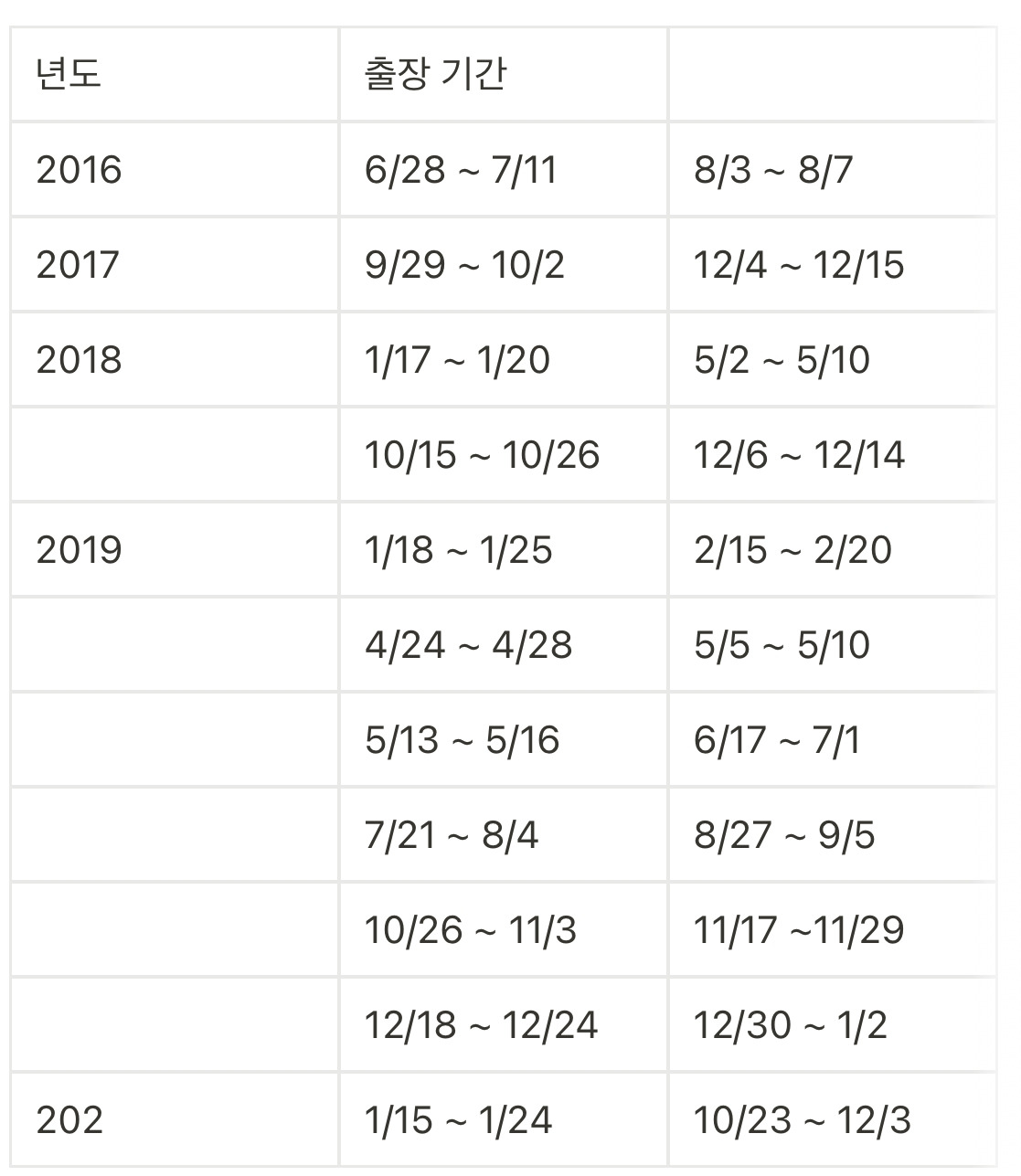 출장의 가장 큰 불만은 불확실한 일정이다. 언제 떠날지 너무 불확실 했다. 많은 출장을 다녔지만 사전에 계획된 출장은 몇 번 되지 않았다. 출장이 언제 떠날지, 며칠 동안 머무를지 모르기 때문에 계획적인 생활을 하기에는 어려움이 있었다. 그나마 한 달 전부터 계획이 되어있는 시생산이나 증설 같은 경우에는 파트원들과 분담하여 출장일정을 미리 정하여 계획적으로 움직일 수 있었으나 그마저도 자주 변경되었다. 출장이 많은 2019년에는 주말 계획을 세우기가 어려웠고, 누가 물어보면 항상 그때 가봐야 알 수 있다는 말 밖에 하지 못했다.