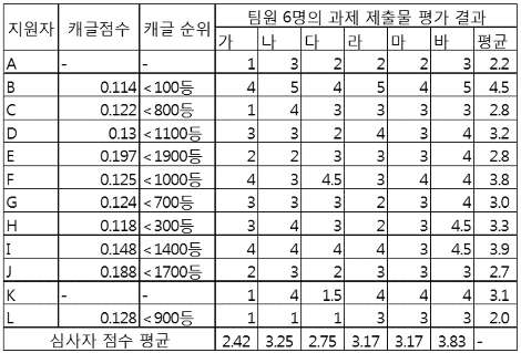 지원자가 제출한 과제 문서와 코드를 검토하여 과제에 대한 평가를 진행했는데 과제 평가에는 6명의 팀원이 참여했으며 과제마다 1~5점의 점수를 부여했습니다. 과제 제출자 12명의 캐글 성적 및 평가 결과는 아래와 같습니다(익명성을 위해 캐글 점수는 소수점 3자리에서 절삭했고 순위도 대략적으로만 표시했습니다).
