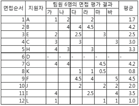 지원자들의 최종 평가 결과는 아래와 같습니다(참고로 저는 전체 채용 과정을 진행하긴 했으나 평가에는 참여하지 않았습니다).