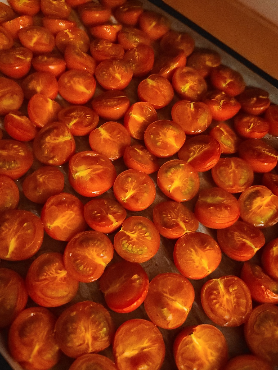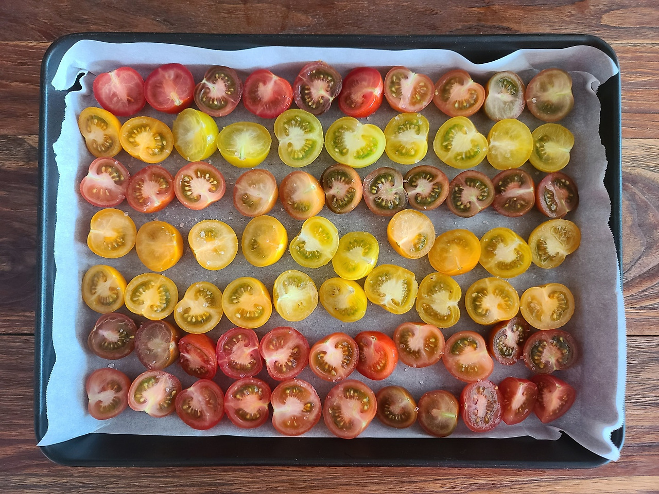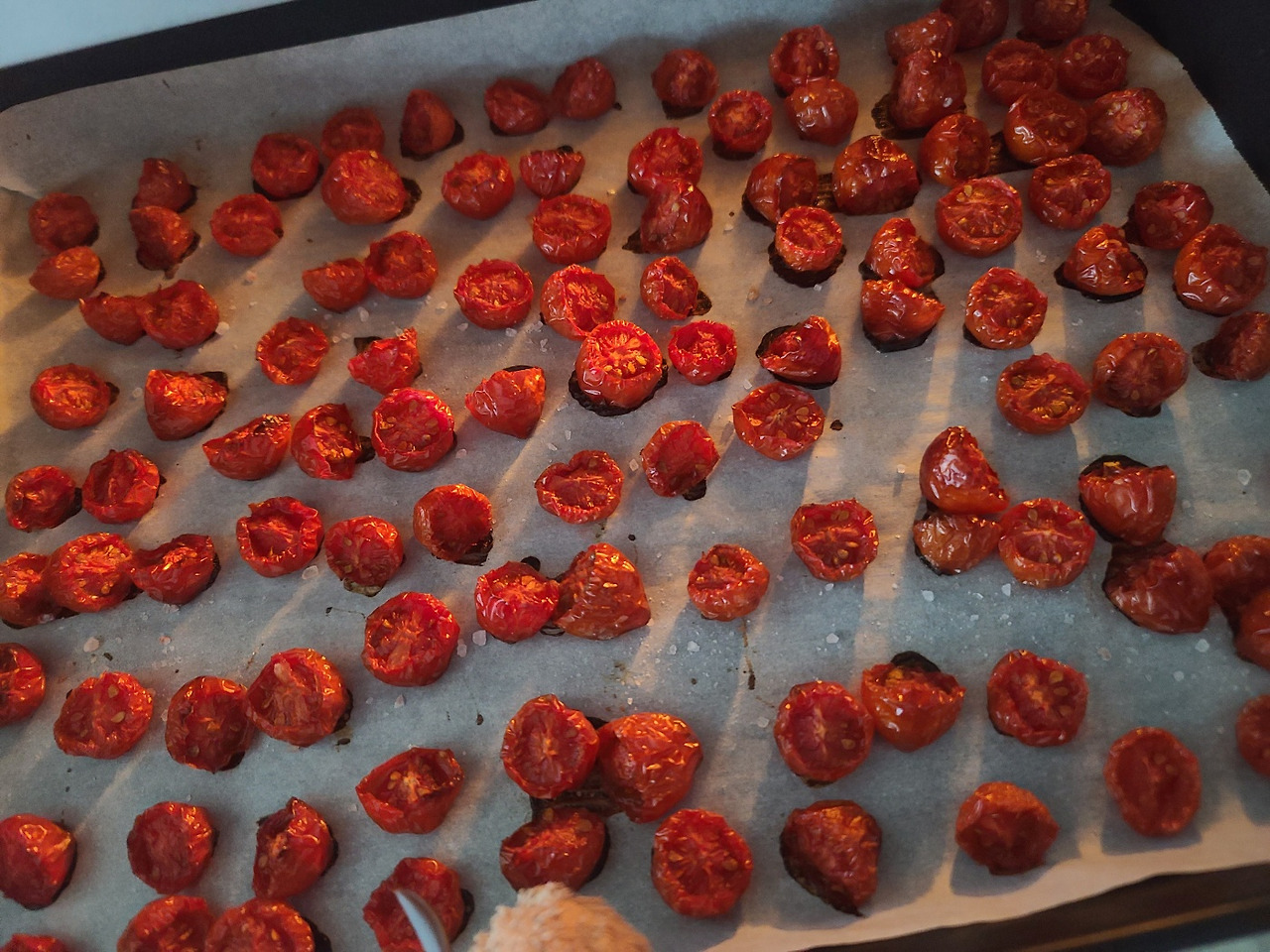 - 방울토마토 사이즈와 오븐 사양에 따라 온도와 시간을 조절한다. (토마토 사이즈와 오븐 온도에 따라 1시간 반~3시간 정도 걸린다.)