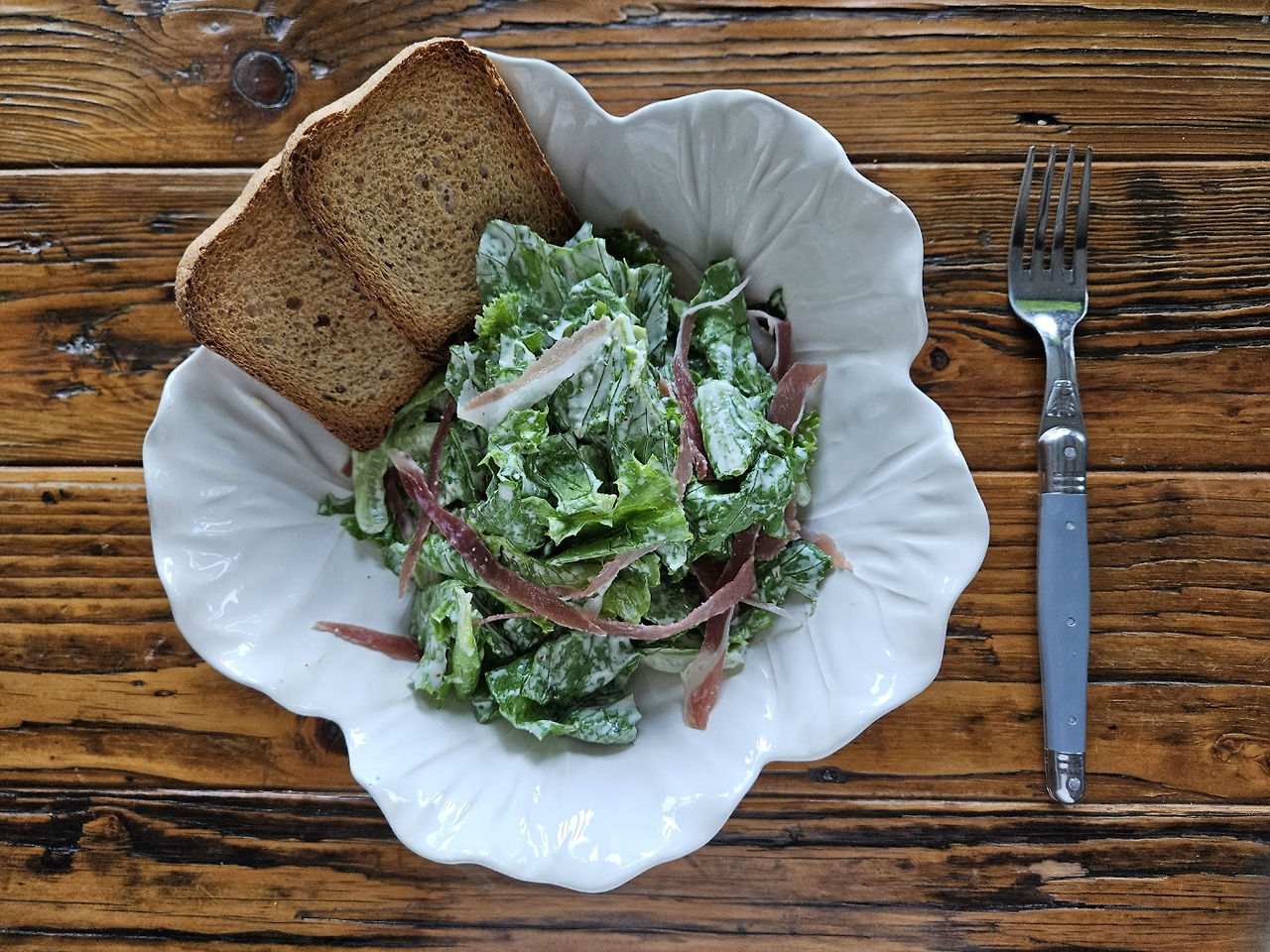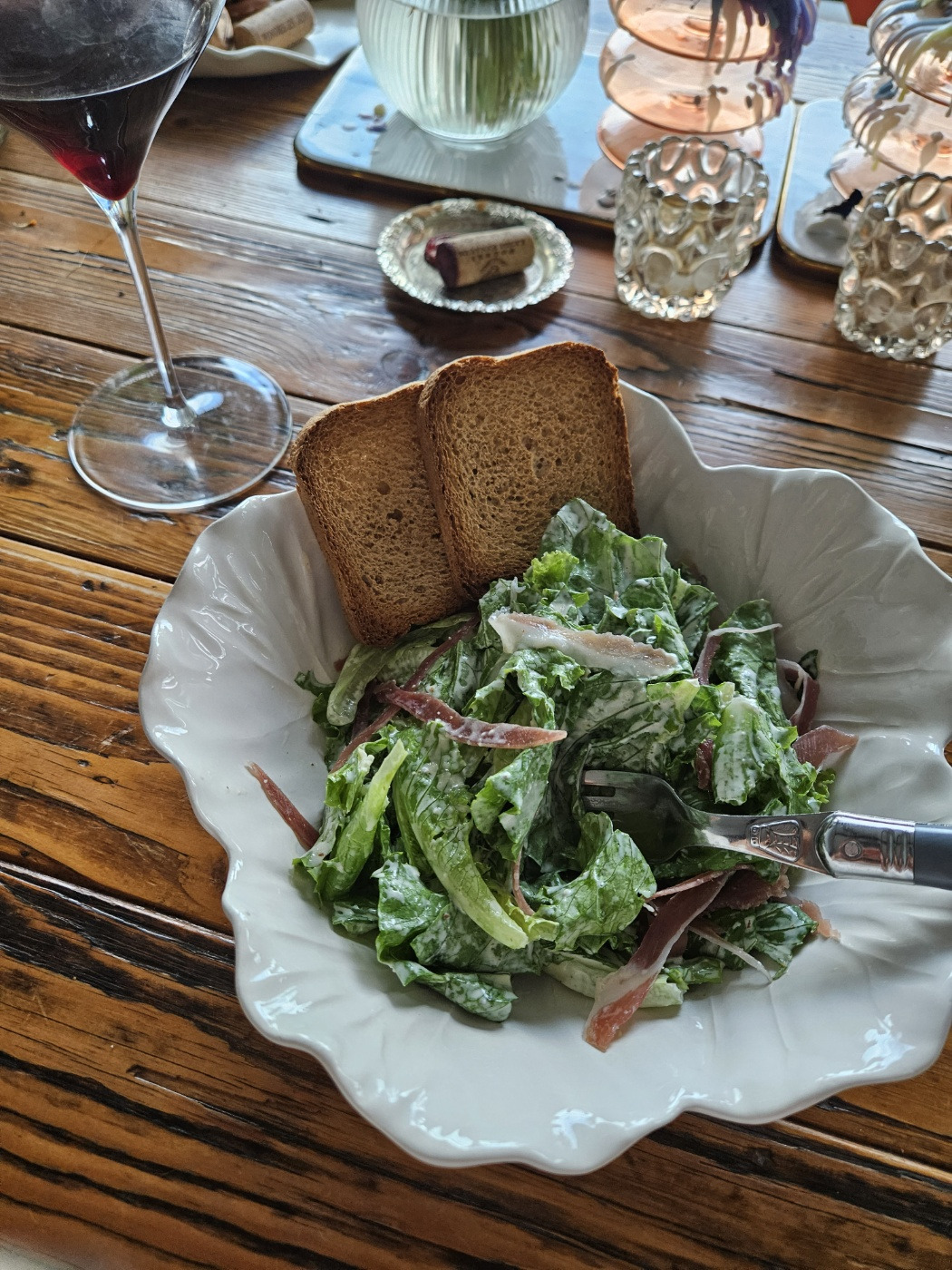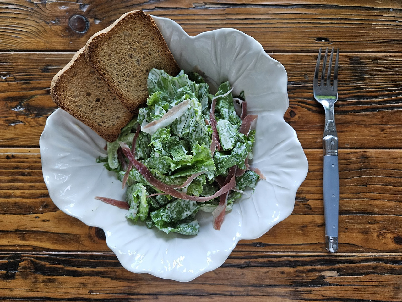기묘한 와인 페어링: 달걀 노른자의 고소함에 엑스트라버진 올리브오일의 크리스피한 부드러움이 더해져 마요네즈가 되고 거기에 다른 방식의 꼬릿함을 내는 앤쵸비와 파르마지노 레지아노가 얹어지고 디죵 머스터드의 산뜻한 매콤함, 레몬즙의 상큼함이 더해져 완성되는 시저 드레싱이 올라간 시저 샐러드는 시원하게 칠링된 프로세코와 곁들이면 아주 환상적이다. 이탈리아 북부의 글레라 품종으로 만들어지는 드라이한 스파클링 와인인 프로세코는 샴페인에 비해 버블의 입자가 크고 거칠지만 더운 여름날에 만나는 그 버블감은 오히려 반가울 수 있다. 맛과 향이 진한 앤쵸비, 파르마지노 레지아노, 마늘 등이 들어가는 시저 드레싱이기에 오히려 아주 섬세한 샴페인보다 더 좋은 페어링이 될 수 있다. 또 잘 익은 산딸기와 석류의 향을 머금은 멜롯 100%나 멜롯 블렌딩의 로제 와인도 좋고, 가벼운 산지오베제 품종의 레드 와인도 좋은데 높은 등급인 끼안띠 끌라시꼬 그랑 셀레지오네의 오크향이 오히려 방해가 될 수 있기에 산뜻한 끼안띠나 끼안띠 끌라시꼬를 추천한다.