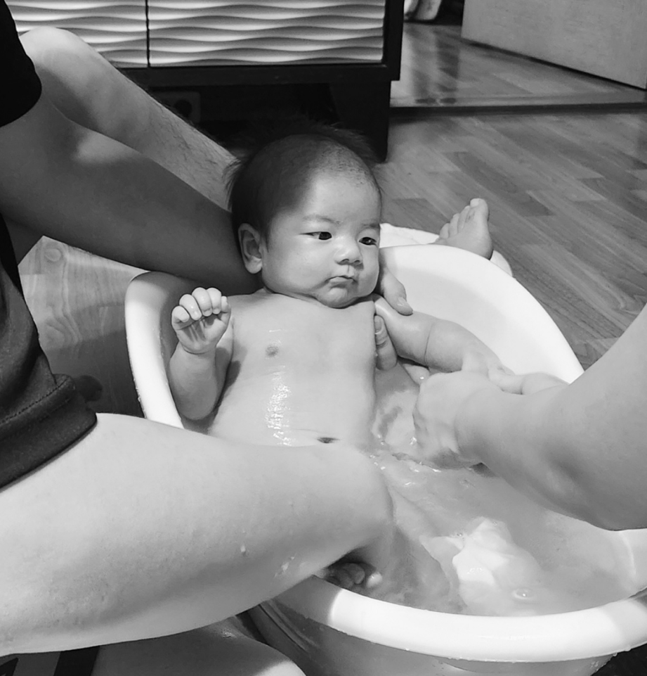 30년 넘게 내 몸만 씻다가 말 그대로 갓 태어난 작은 몸을 씻기는 건 꽤나 무섭고 낯선 일인지라 초보 부모는 배움이 필요하다. 준비물은 아기 몸이 겨우 들어가는 작은 욕조 2개와 천기저귀.(목욕 후 수건으로 쓰인다.) 욕조 하나는 목욕용, 하나는 헹굼용이다.