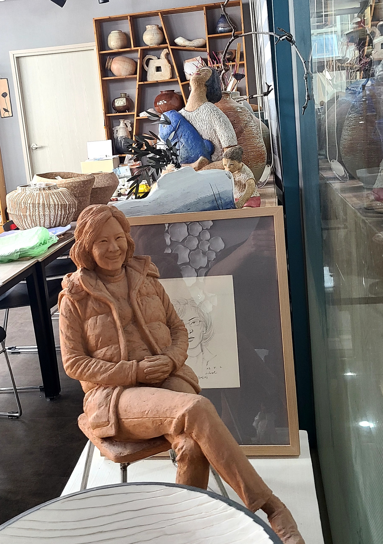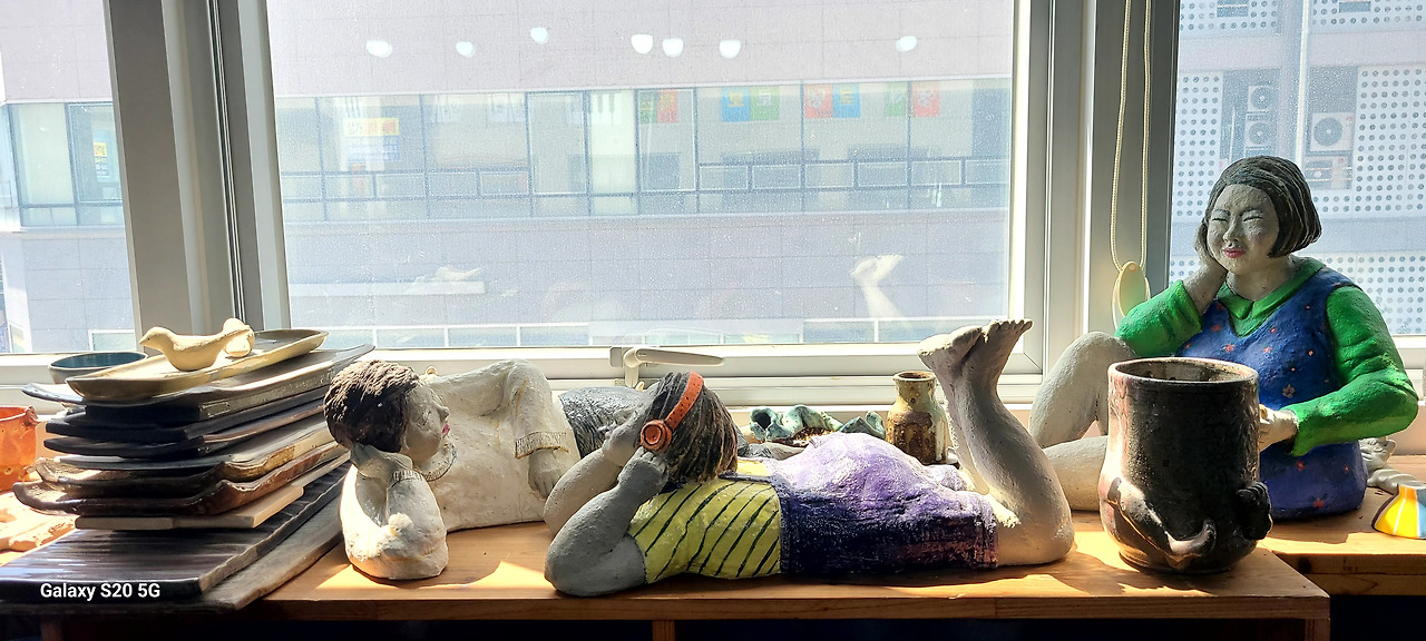 저는 10년 만에 한국에 돌아와 지쳐있는 데다, 어머님 병간호로 힘든 날을 보내고 있었어요. 그런 저를 언제나 밝은 얼굴로 맞아주시고 작업실 한쪽 편을 내주신 선생님이 좋았습니다. 그 당시 제가 살고 있던 집에서 도보로 30분 정도 거리에 있는, 선생님 작업실에 놀러 가기 시작했었습니다. 한지 작가님 작업실이나 다른 작가님들 작업실에서도 그렇듯, 커피 한잔 테이블에 올려놓고 물고기 만드는 작업을 도와드리며 이야기 삼매경에 시간이 가는 줄 몰랐죠. 그리고 흙을 만지며 지친 저의 마음도 다시 밝아지기 시작했습니다.