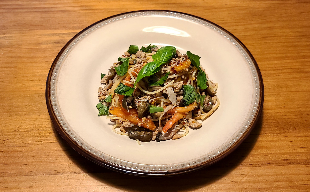 버섯·가지·다진 돼지고기볶음을 이용한 스파이시 오일 파스타