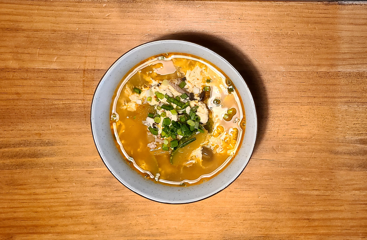 끓는 육수에 호박 나물과 30g 정도 남아있던 버섯·가지·다진 돼지고기볶음을 넣어 끓인다.