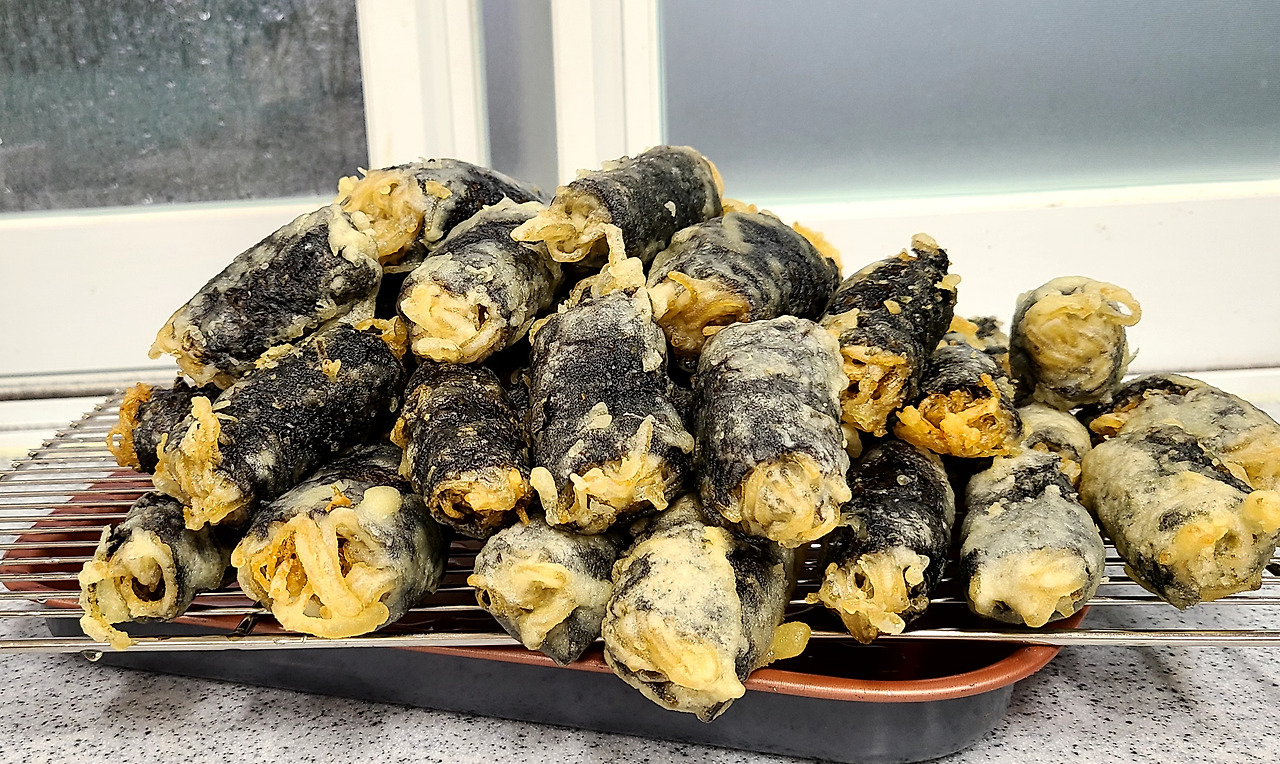 삼등분한 돌김에 양념된 당면을 넣고 돌돌 말아놓은 김말이를 밀가루와 물을 1:1 비율로 반죽한 튀김옷을 묻혀 180도 기름에 튀겨내기 시작한다. 그래도 몇 번의 튀김 요리를 해봤던 아이들이라 그런지 나름 프로다운 몸동작으로 온도를 맞춰 노릇노릇 튀겨낸다.