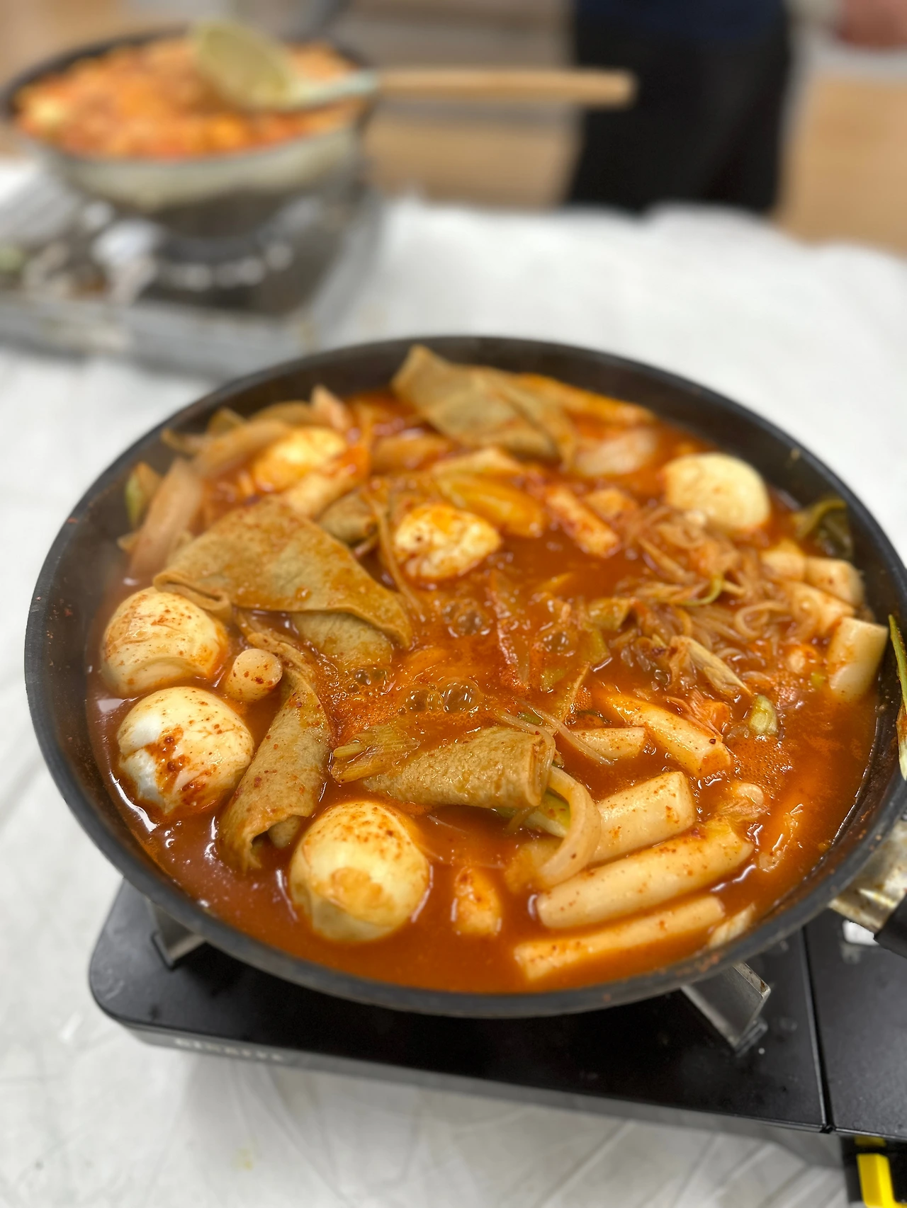 “자 냄비에 양배추, 파, 떡, 어묵, 쫄면과 고추장, 고춧가루, 설탕, 간장, 마늘 그리고 물엿으로 만든 양념장을 넣는다. 그리고 끓여줍니다. 이것이 즉석떡볶이야.”