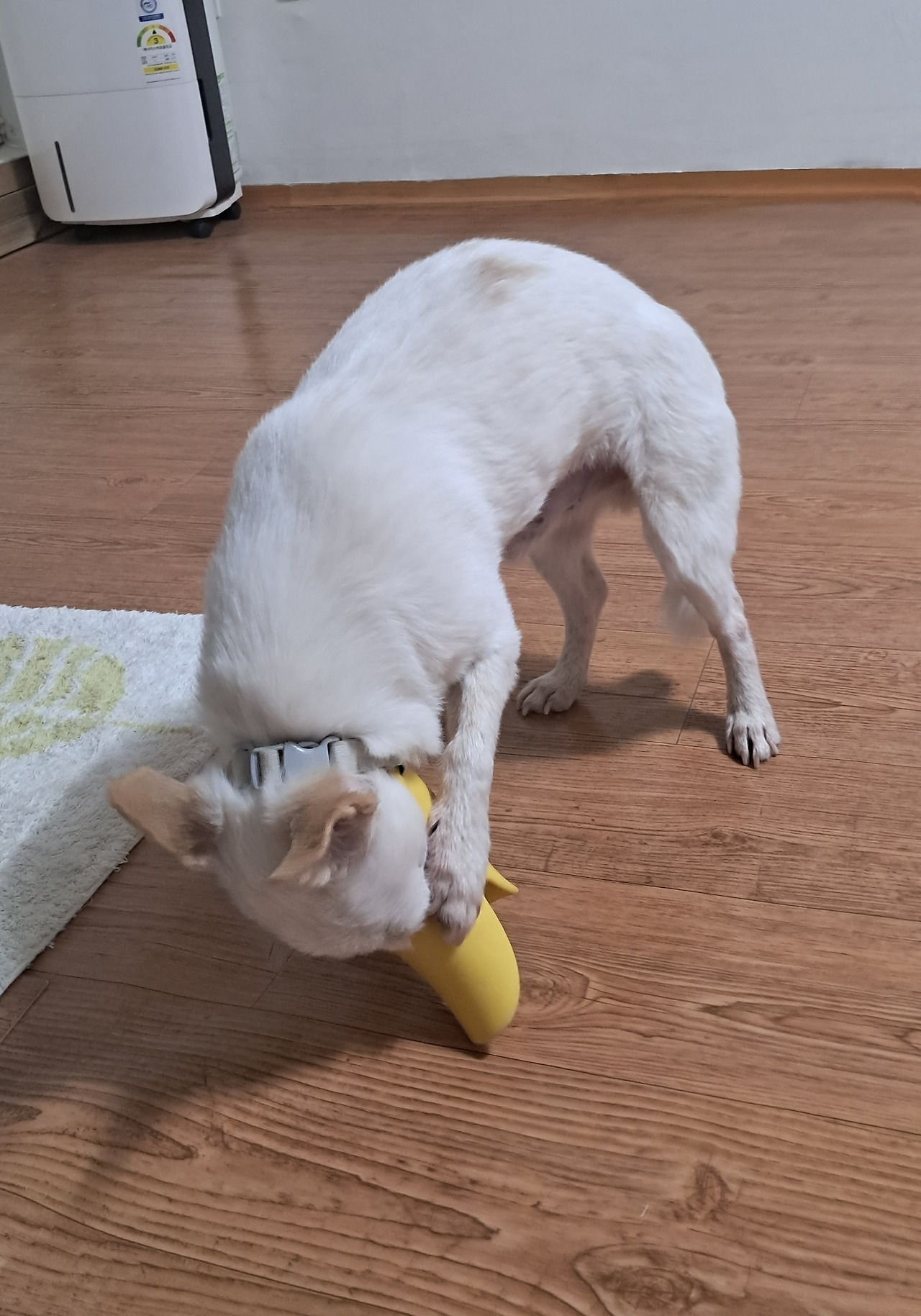 아무래도 몇 달 동안 짬밥에서 멀어지게 하려 하네스를 하고 산책하고, 오리주둥이를 입에 차고 돌아다니다 오래간만에 맛본 자유를 잊지 못하나 보다. ‘그래도 이건 아니잖아.’라며 길동이의 몸통을 돌리려다 샤워기를 떨어트렸다.