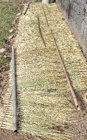 우린 만들어진 이엉을 들고 마늘밭으로 갔다. 그리고 그 위에 덮어 주었다. 완벽하다.