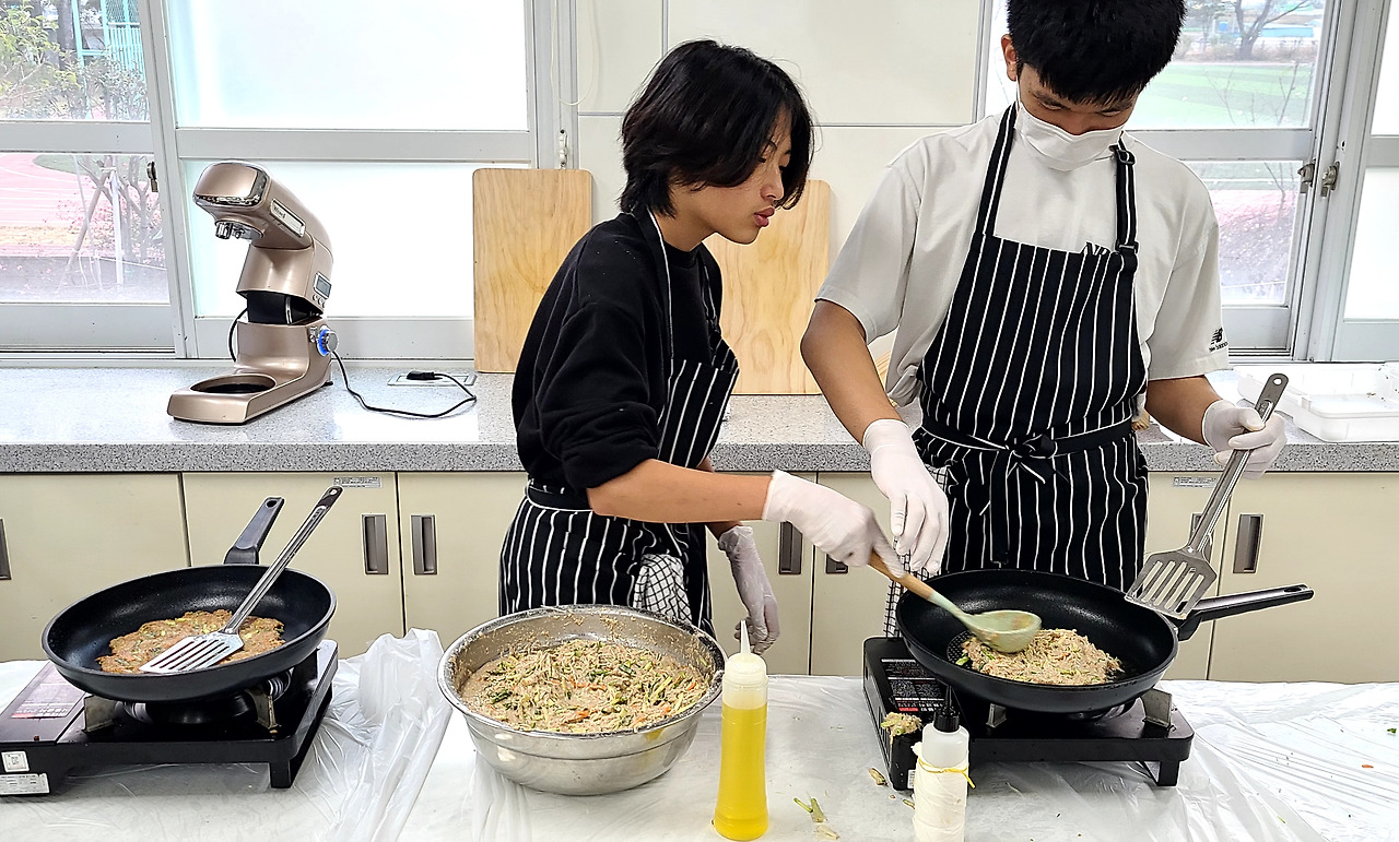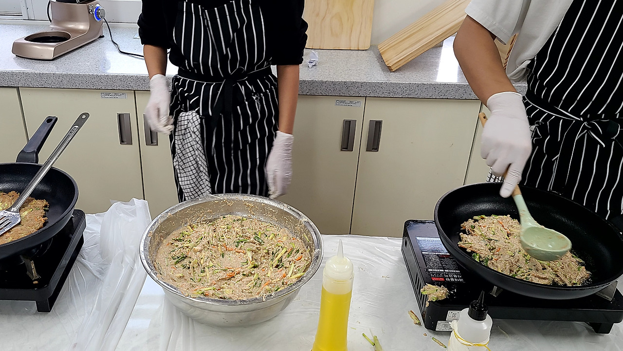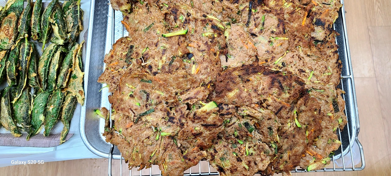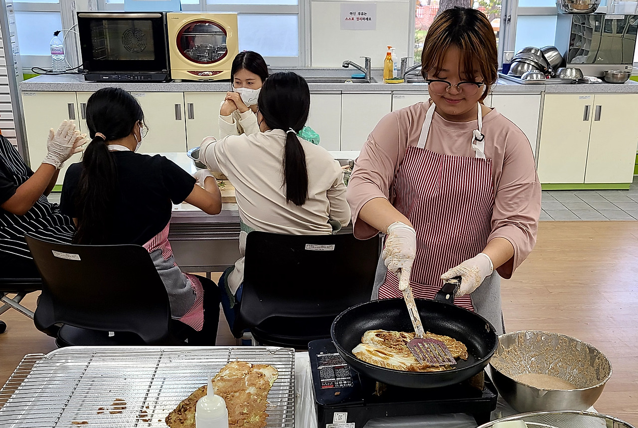 아이들이 분주하게 준비한 재료들을 모으고 모아 전을 부치기 시작했다.