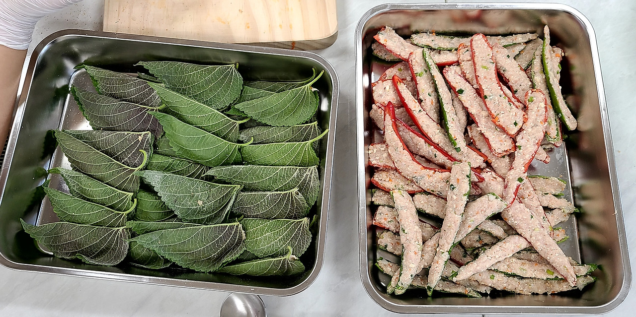 “깻잎도 씻고, 고추도 반으로 갈라 씨를 빼냅니다.”