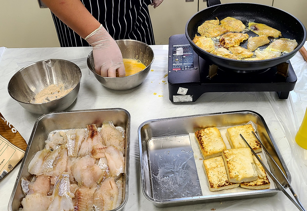 소금과 후추로 간하고 물기를 톡톡 닦아줍니다. 그리고 밀가루를 골고루 묻히고 잘 풀어진 달걀 물에 적셔 프라이팬에 구워준다.