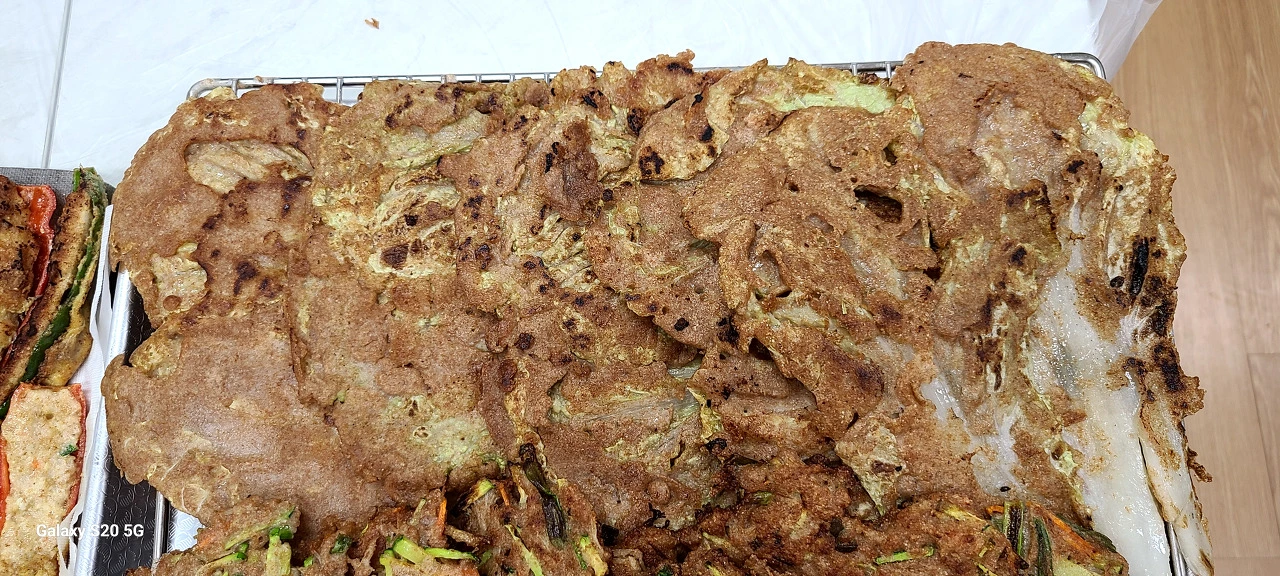 잘 절인 배추를 씻어 밀가루 반죽에 적셔 프라이팬에 구워준다.