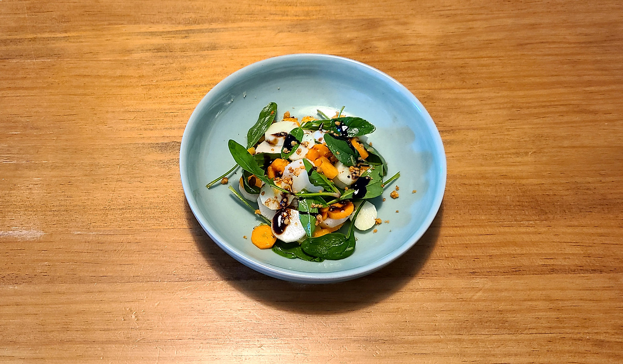 소금과 후추 그리고 마늘 약간, 크러쉬드 레드 칠리 조금, 탱자즙 살짝, 레몬즙 살짝 마지막 엑스트라버진 오일에 무쳐 그릇에 담고.