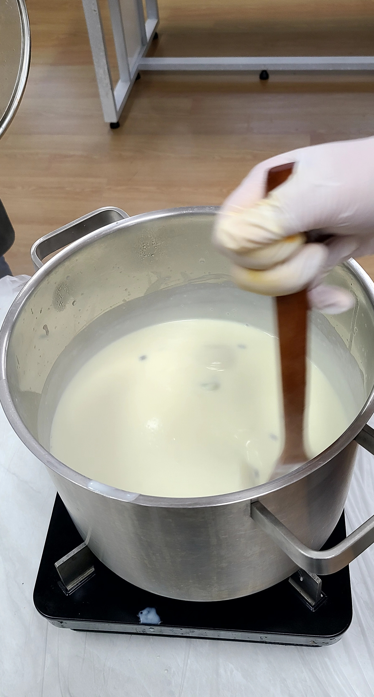이제 우유를 부어줄 겁니다. 조금씩. 조금씩. 저어가면서. 뭉치지 않게. 잘 저어주세요.