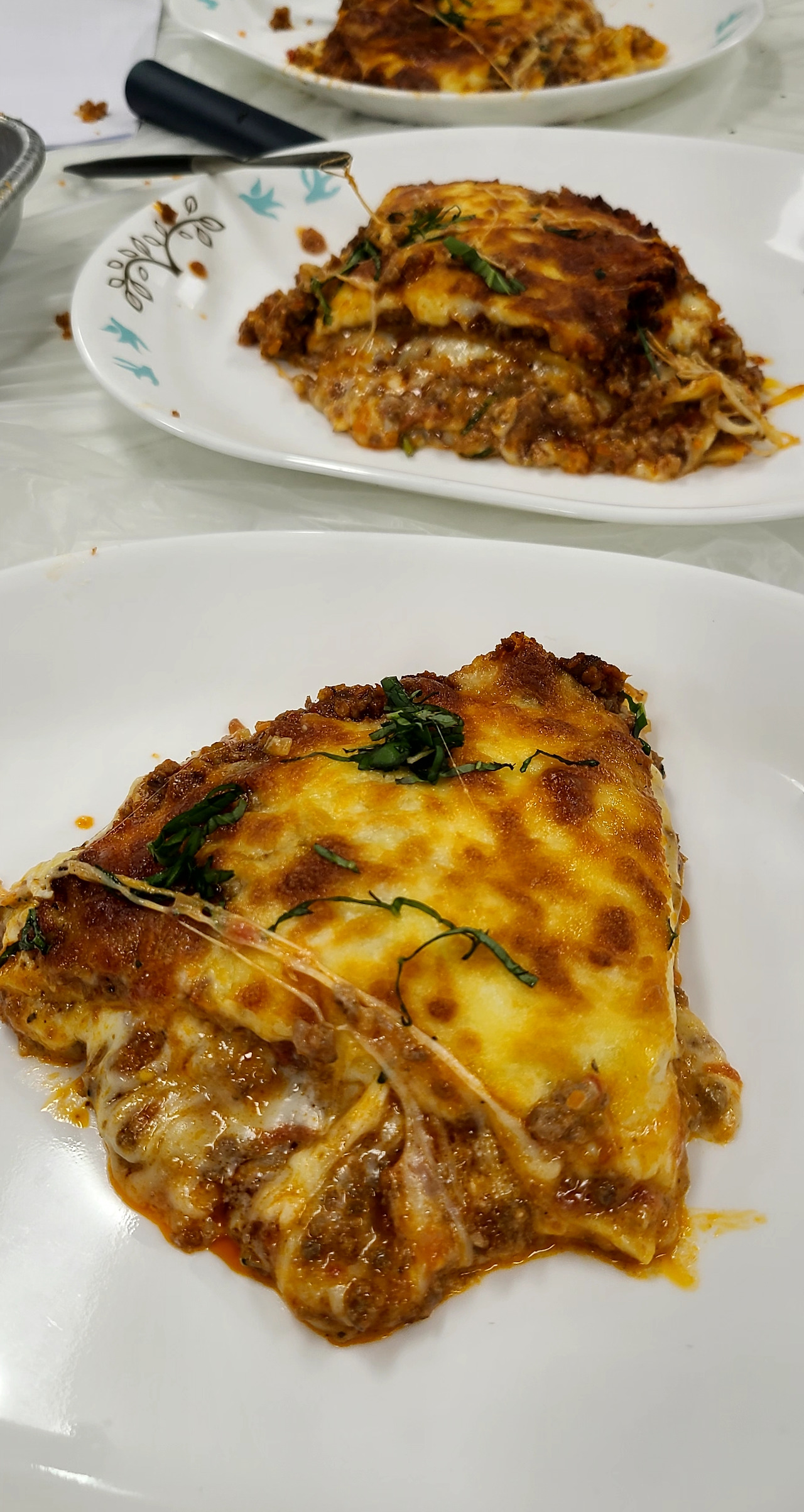 라구소스를 펼쳐주고, 베샤멜을 올리고, 그 위에 모짜렐라 치즈를 골고루 뿌려주세요.