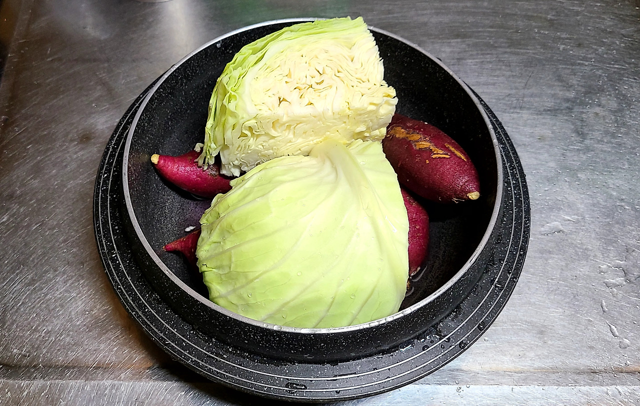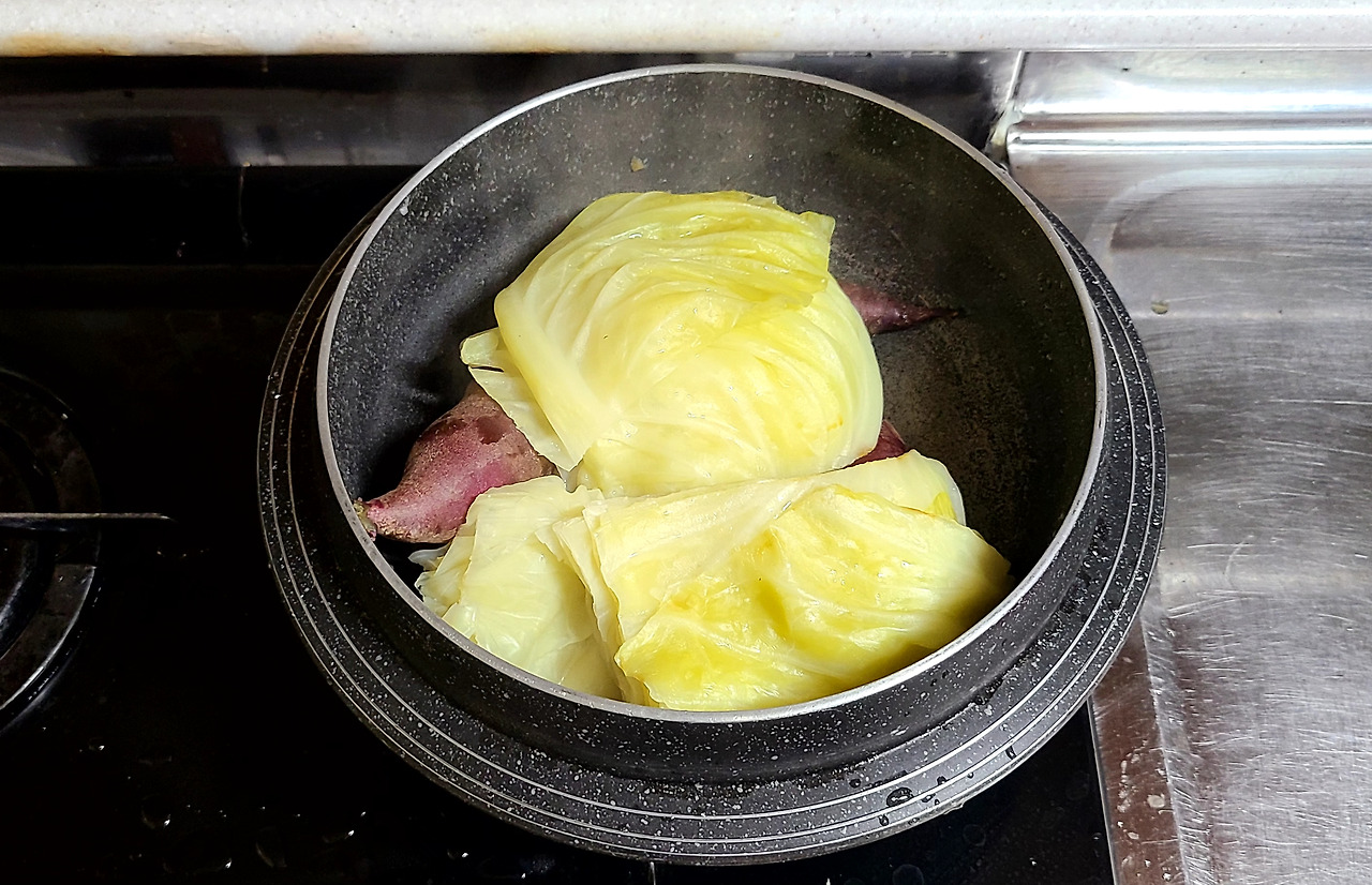 거실 한쪽에 보관해 둔 박스에서 고구마를 꺼내 깨끗이 씻어 솥에 넣었다. 살짝 남는 자리에 양배추도 씻어 올려놓았다. 이렇게 하면 많은 물이 필요하지 않다. 산에서 받아 온 약수를 한 컵 정도 솥에 넣어 가스레인지 불을 켰다. 처음엔 강에서 끓으면 약으로 줄이면 된다.