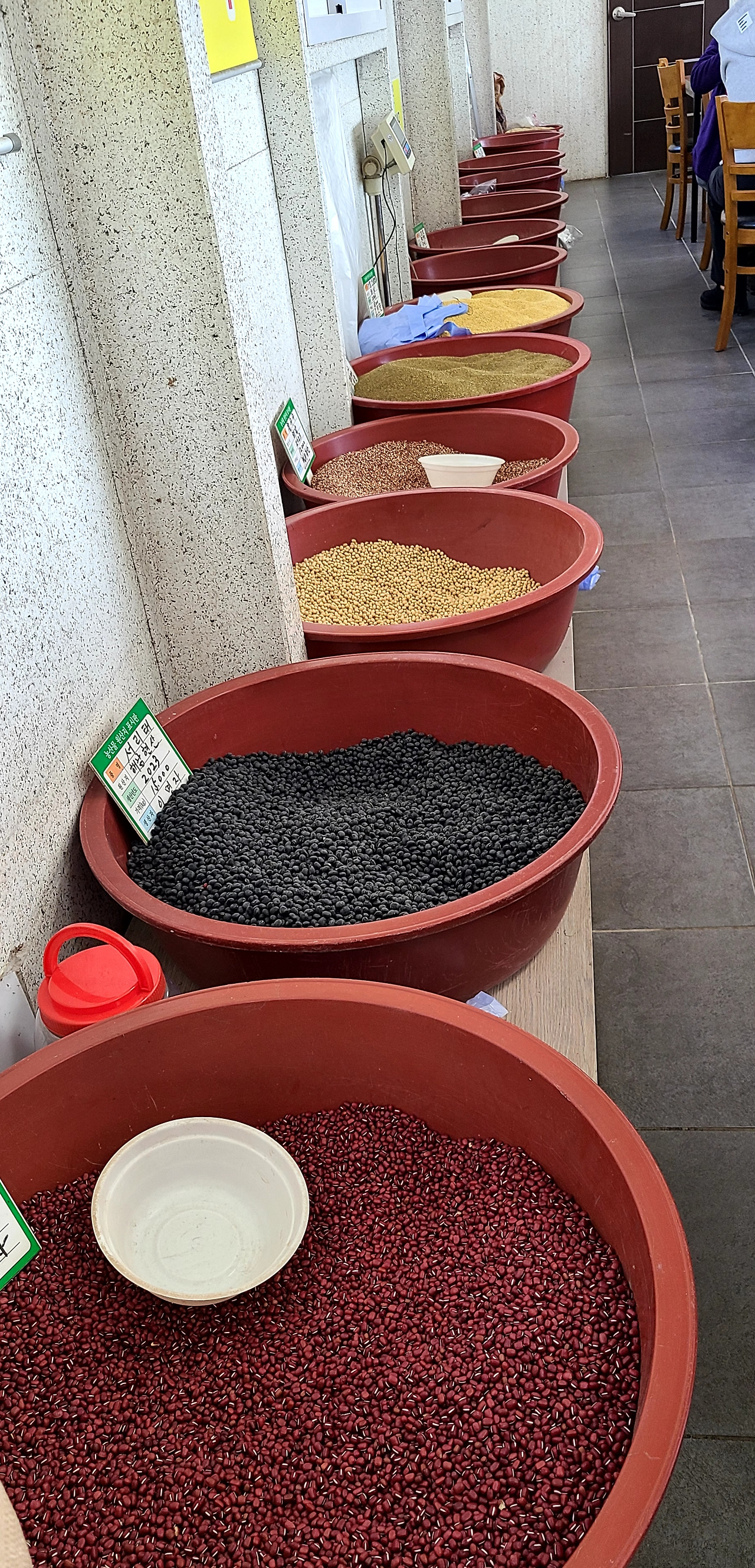 맨 안쪽에 지역에서 재배한 질 좋은 팥, 콩, 쌀, 차조, 보리 등의 곡식과 콩이 줄지어 주인을 기다리고 있다.