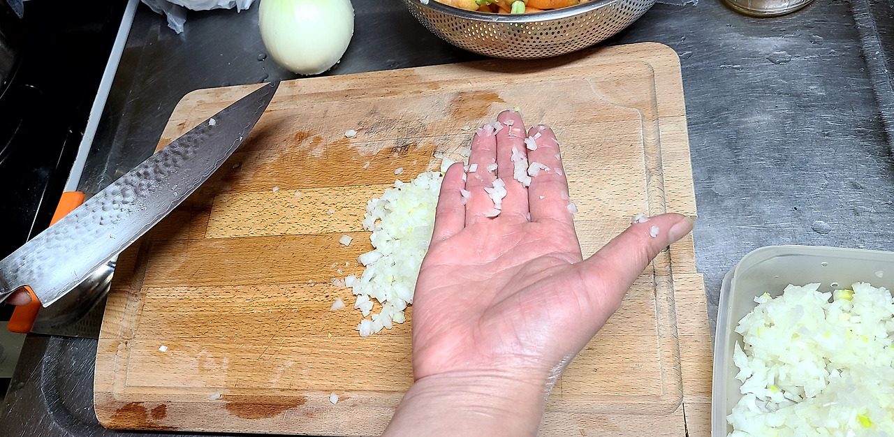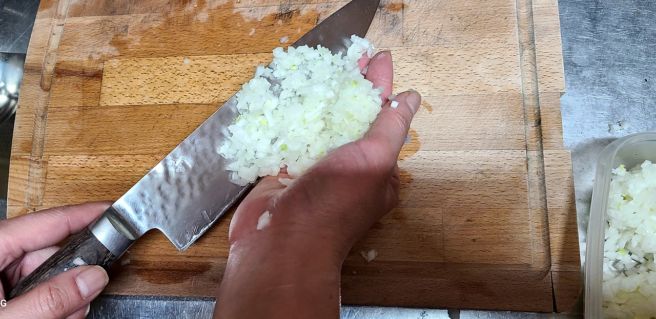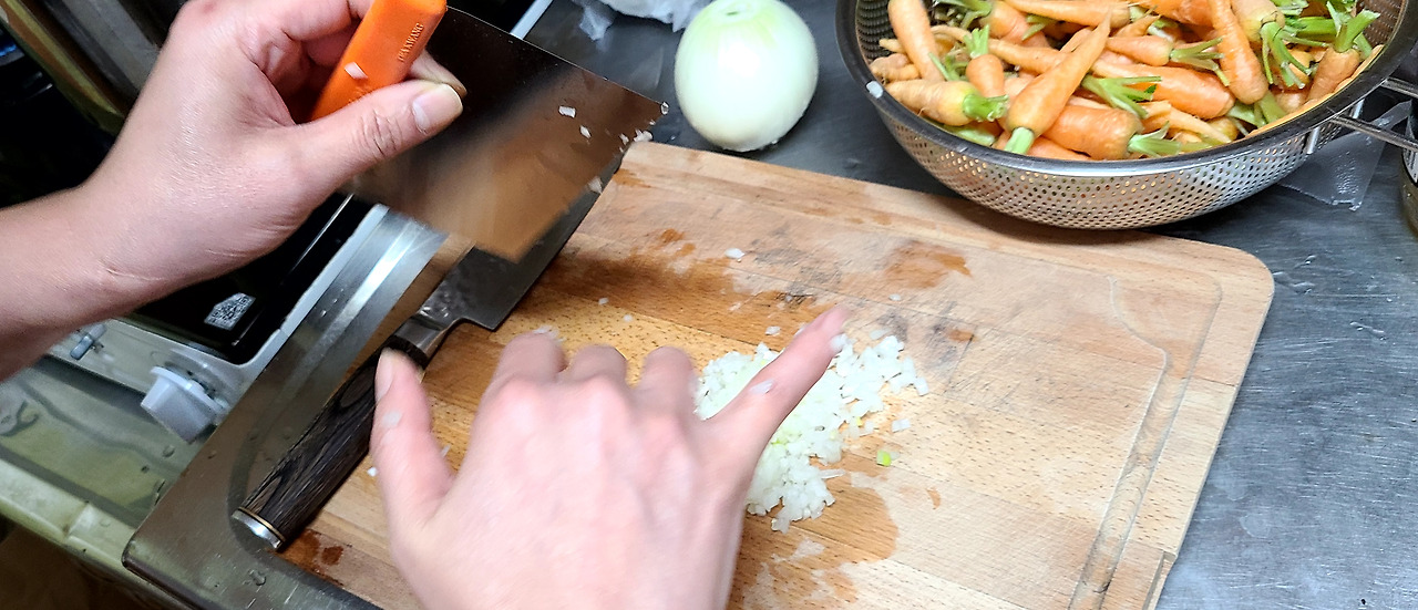 도마에 몇 개 놓인 마늘을 칼등으로 탁탁 내리쳐 납작하게 해 주고 다지기 시작합니다. 여기저기 튀어나가죠. 칼로 긁어모아줍니다. 그러면 칼에 붙어있는 마늘 조각은 어떻게 하죠? 손으로 떼어 냅니다. 처음 요리를 접한 분들은 칼에 붙은 재료를 손으로 쓸어내리는 것을 무서워합니다. 혹시라고 칼날에 손이 베일까 봐 말입니다.