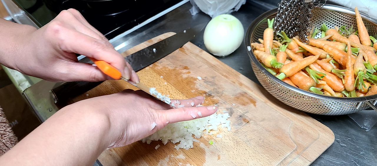 재료를 다듬어 도마에 올려 칼을 쓰는 요리할 때 가장 많이 신경을 써야 할 부분이 안전입니다. 무거운 것을 들 때나 불을 사용할 때도 당연히 안전이 중요합니다. 하지만 칼을 이용할 때 살짝이라도 손이 베이는 일이 생길 수 있어 신경을 곤두세우고 있지요.