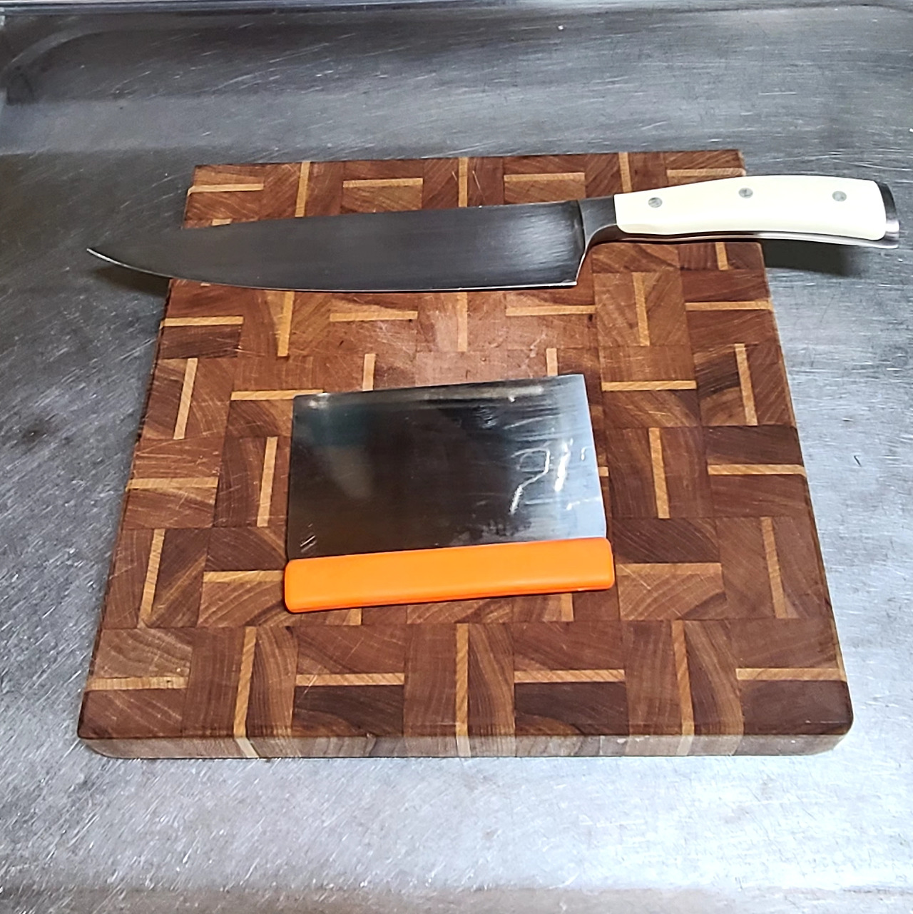 왜 이런 질문을 받는지 살펴보자면, 채소나 음식 재료를 손질하고 손으로 툭툭 자르지 않고 썰어야 할 경우, 전 얇은 행주에 물을 적시고 짜서 조리대에 깔고 도마를 올립니다. 그리고 칼을 꺼내죠. 그다음 따라오는 또 한 가지 도마 옆에 '스크래퍼'를 꺼내 놉니다.