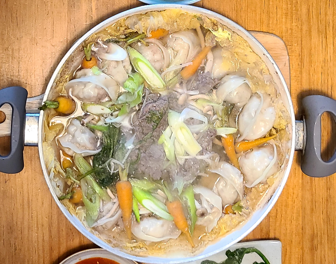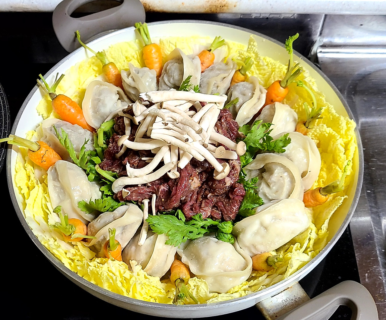 하얀 전골냄비에 썬 배추를 넣고 만두, 쑥갓, 버섯, 미니당근, 소고기를 넣고 끓입니다.
