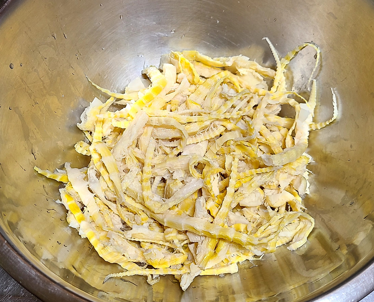녹여둔 죽순을 가늘게 찢고 면 보자기에 쌓아 물기를 짜줍니다. 그리고 볼에 담아놓아요.