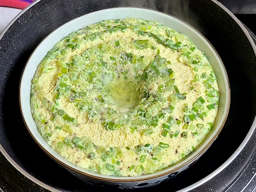 잘 섞어졌다 싶으면 달걀 양의 5분에 2 정도의 물을 넣습니다. 반보다 조금 적은 양이지요.
