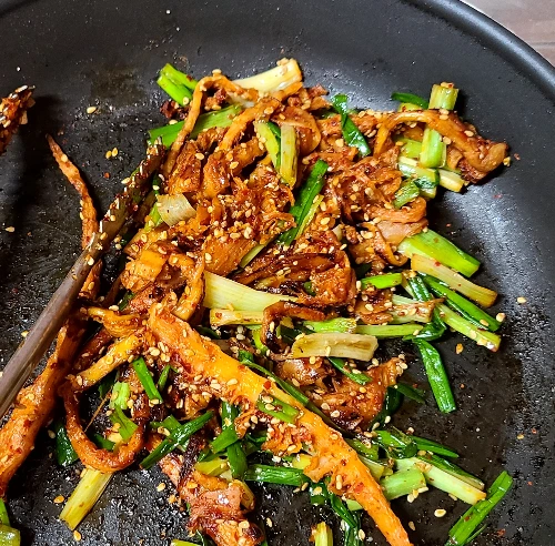 뜨겁게 달군 프라이팬에 채소 기름을 두르고 양념한 죽순을 넣어 여러 차례 뒤적여 볶아준 후 중간 불로 줄여 완전히 익혀줍니다. 다시 강한 불로 올려 썰어 놓은 쪽파를 넣고 빠르게 볶아 불맛을 넣어주고 불을 끕니다. 여기에 갈아놓은 깨와 참기름을 넣어 섞어줍니다.