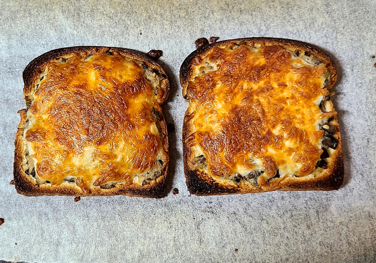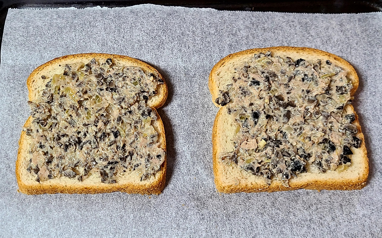 빵에 올리브 스프레드를 올리고 모짜렐라 치즈를 올려 구워 먹었다.